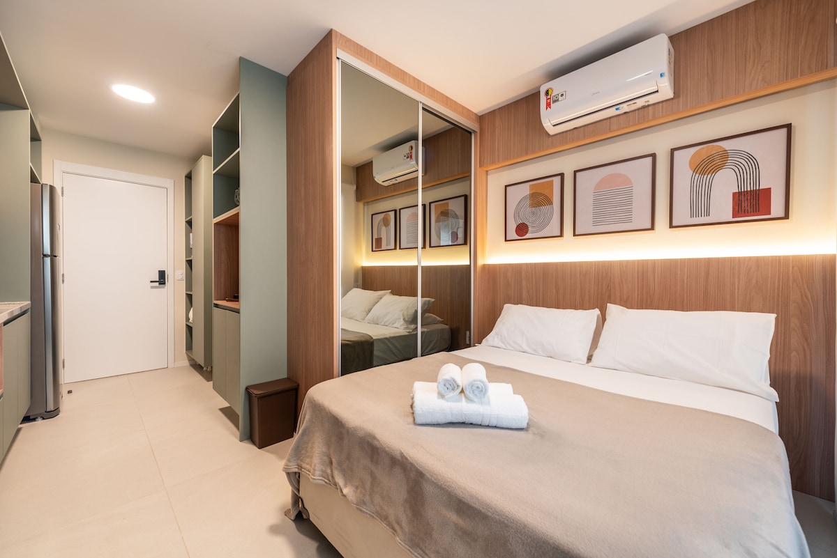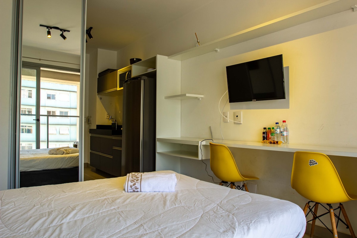 Brand new apartment, with a contemporary style, of a high standard and very well located, with a privileged view of Allianz Parque. Next to shopping malls, various businesses, means of transport, parks, tourist attractions and business buildings. The studio is complete, with a comfortable queen bed, Smart TV and Internet. Kitchen with all utensils, cooktop, refrigerator and microwave. With parking (rotary). Close to everything, cozy, perfect for experiencing fantastic moments.