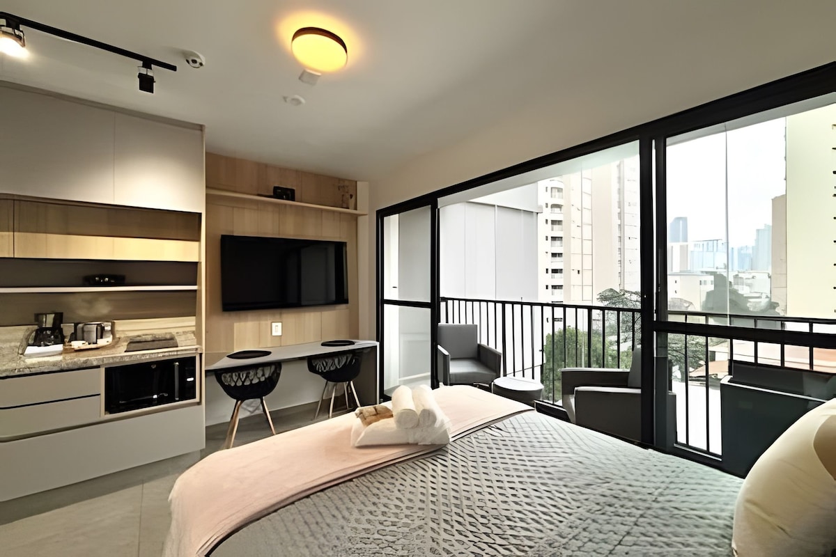 Studio 40011: 4 min do Allianz Parque. Estúdio compacto, moderno e completo e confortável em uma das regiões mais culturais de SP. 📍 Cercado por cafés, restaurantes e shows. Aqui a cidade pulsa ✨ Cama aconchegante, bancada, armário, ar-condicionado, TV, e cozinha equipada com sanduicheira, air fryer, cafeteira, fogão, geladeira. 🚿 Banheiro privativo e iluminação acolhedora. com aquele clima de "quero ficar mais um pouco" Perfeito para curtir, descansar ou trabalhar. Reserve agora!