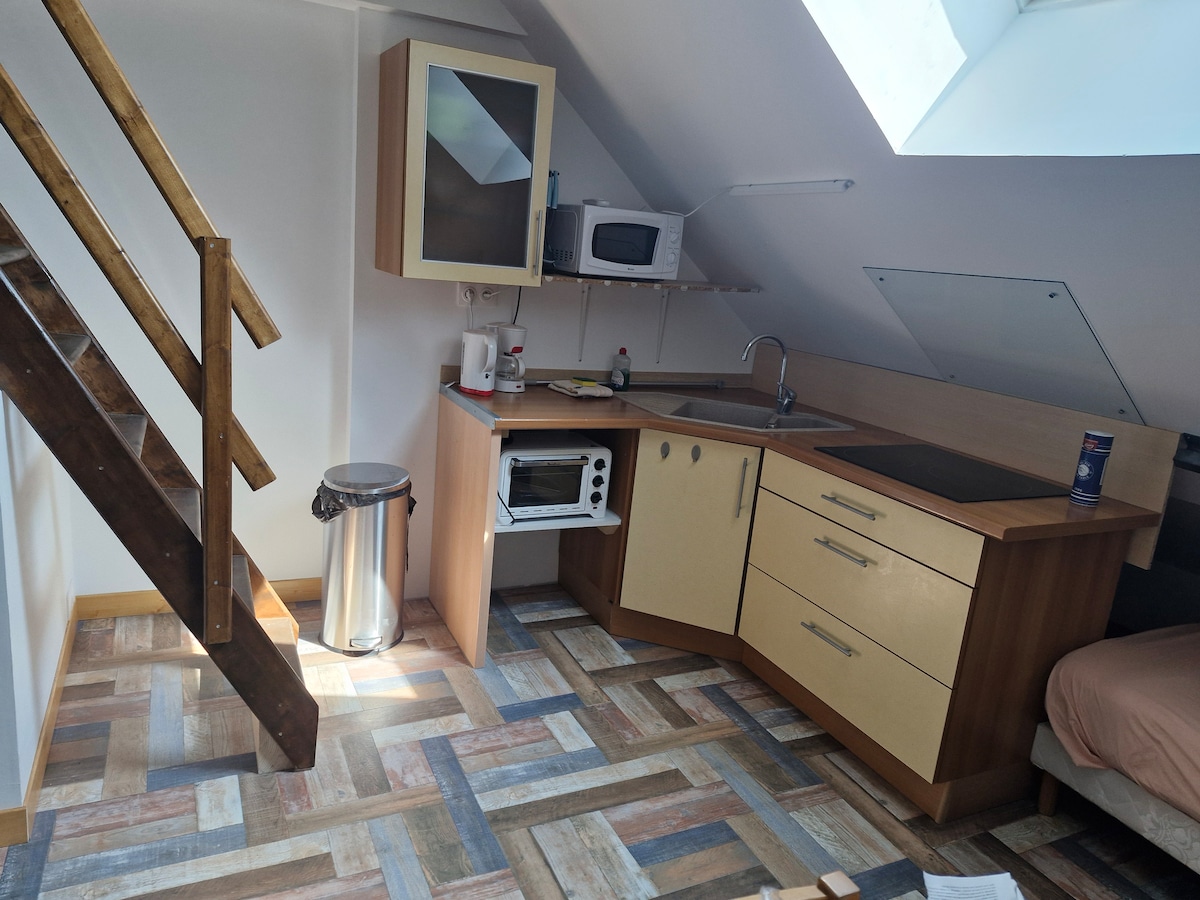 APPART de 27m2 au 1er étage, composé de : 1 palier vestiaire, 1 pièce à vivre avec cuisine ouverte entièrement équipée ( lave-linge, cuisinière induction avec hotte, micro-onde, cafetière, bouilloire, grille pain, frigo ) avec coin TV, 1 chambre lit double, literie neuve. 1 salle de bain avec vasque, douche, sèche serviette et WC indépendant . L’ appartement a été entièrement refait à neuf, au calme dans une rue à sens unique, avec stationnement gratuit.