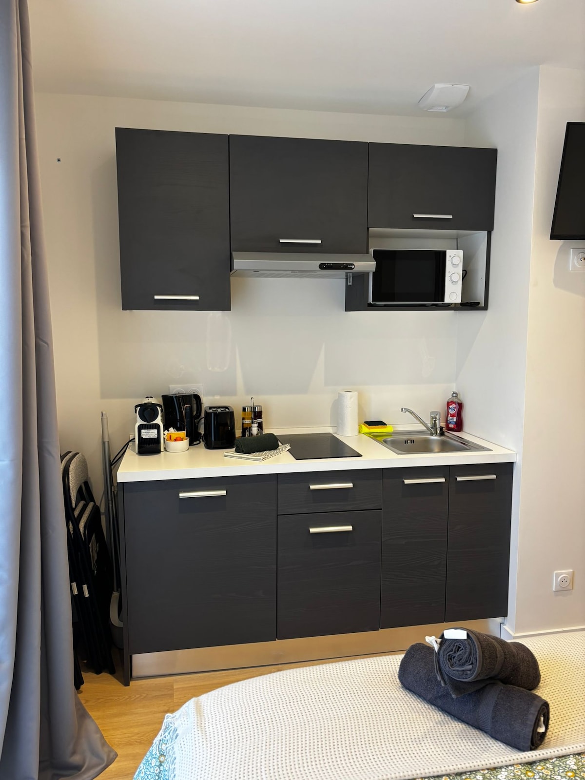 Welcome to your elegant and bright apartment in the heart of Vichy! - Refurbished 32m2 apartment, ideal for 2 travelers. - Fully equipped kitchen, bathroom with shower, flat screen TV, and Wifi. - Close to parks (1min), supermarket (2min), Opera, and thermal baths (5min). - Includes complimentary household linen (sheets and towels). - Flexible self check-in with key box. - Free outdoor parking available 500 meters away.