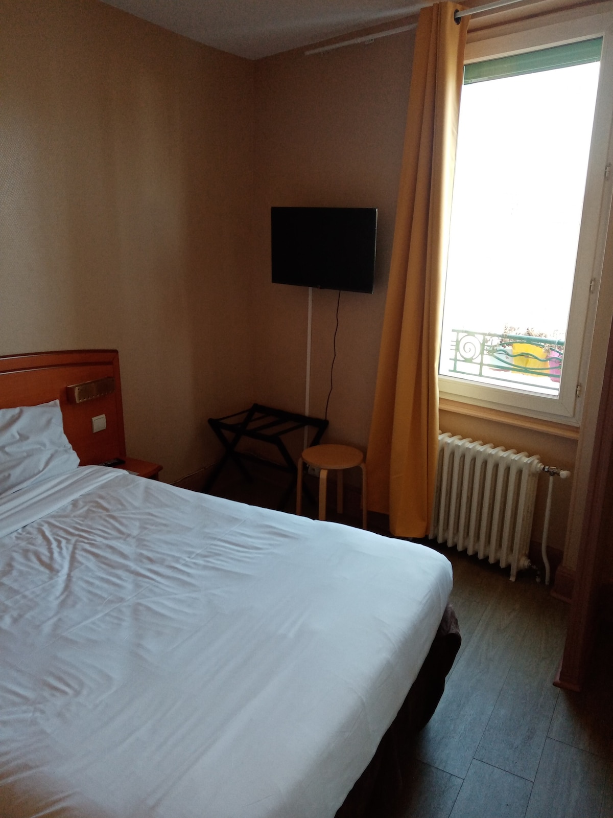 Bienvenue dans notre chambre PMR, au premier étage de notre hôtel à Digoin. Accessible par ascenseur, elle offre une grande salle de bain et deux lits (un grand lit et un lit simple). Notre établissement propose un parking privé, des petits déjeuners (en supplément). Arrivée entre 17h et 20h, départ entre 7h et 11h. Profitez d'un séjour confortable et pratique dans notre hôtel !