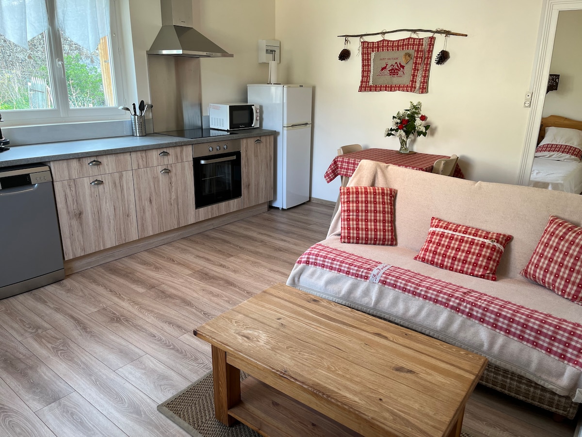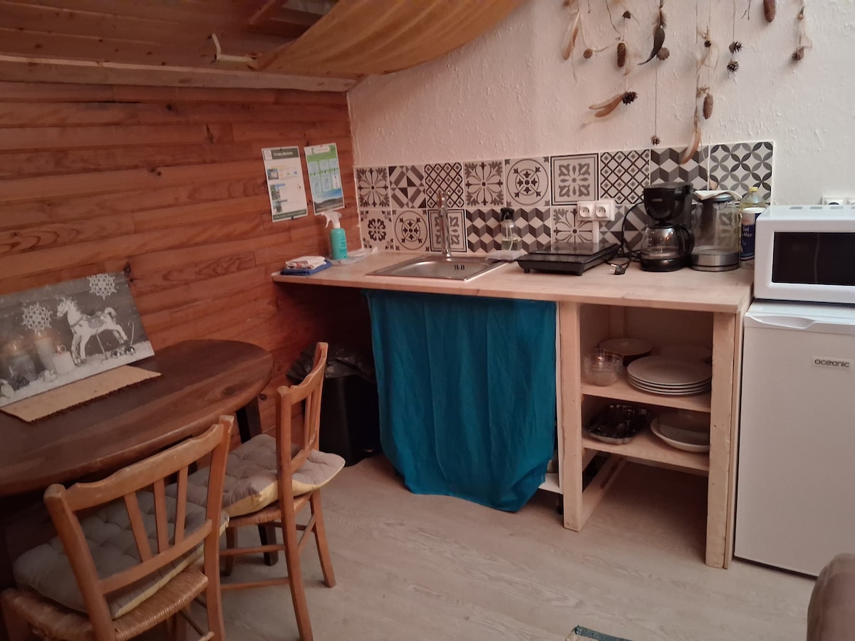 Studio en rez de Chaussée Coin cuisine équipée réfrigérateur, plaque induction 1 feu,bouilloire, cafetière, smart TV, wifi 1 lit 160 avec 2 matelas côte à côte au même niveau non dissociables. Draps et serviettes fournis. Salle de bain avec vasque, douche italienne et wc. Randonneurs : gardiennage possible de voiture, moto ou vélo sur demande. Cyclistes : Parking vélos possible sur demande. Entrée et sortie flexibles. Nous consultez pour confirmer départ après 10h et arrivée avant 16h.