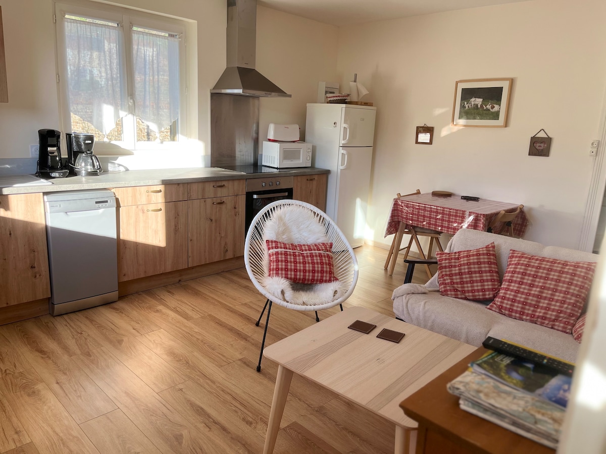 Ambiance Montagne pour cet appartement spacieux de 35 m2 Exposition Est/Nord et Ouest. Labellisé 3* en Meublé de Tourisme escalier extérieur . Jardin commun spacieux aménagé et bien exposé avec une très belle vue. Environnement calme et authentique dans une nature préservée, tout en étant proximité de petits commerces. La maison est très bien située dans un rayon maxi de 30 km pour visiter toutes les curiosités naturelles , culturelles et gastronomiques au Cœur des Volcans.