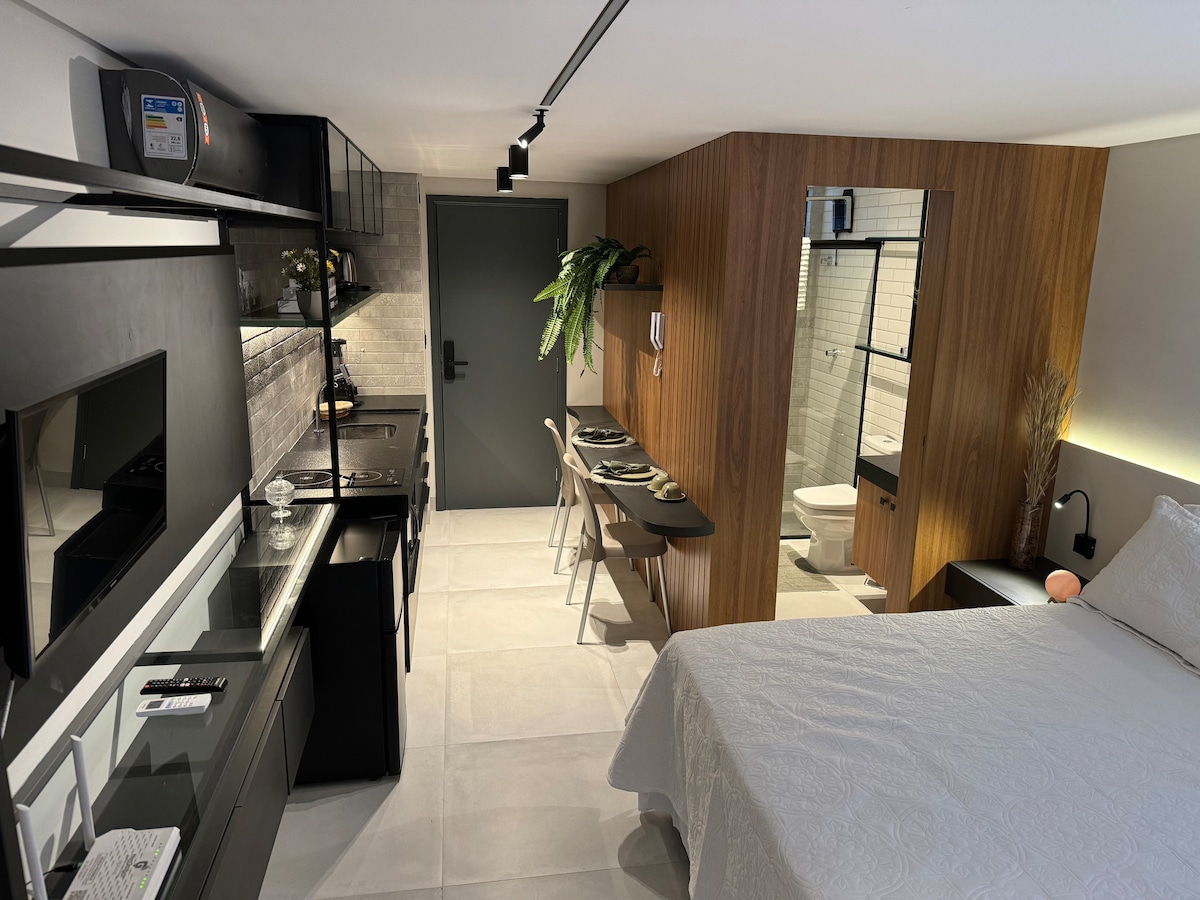 Flat com decoração de alto padrão pensado para curtas ou longas estadias. Perfeito para casais, pessoas viajando sozinhas a lazer/trabalho ou famílias com um filho. Estrutura para até 3 pessoas. Apê pé na areia, onde você escuta o som do mar. Farmácia, padaria, mercados e restaurante próximos. O melhor custo benefício da região para quem pretende ir às compras, bares e restaurantes de frente para o mar.
