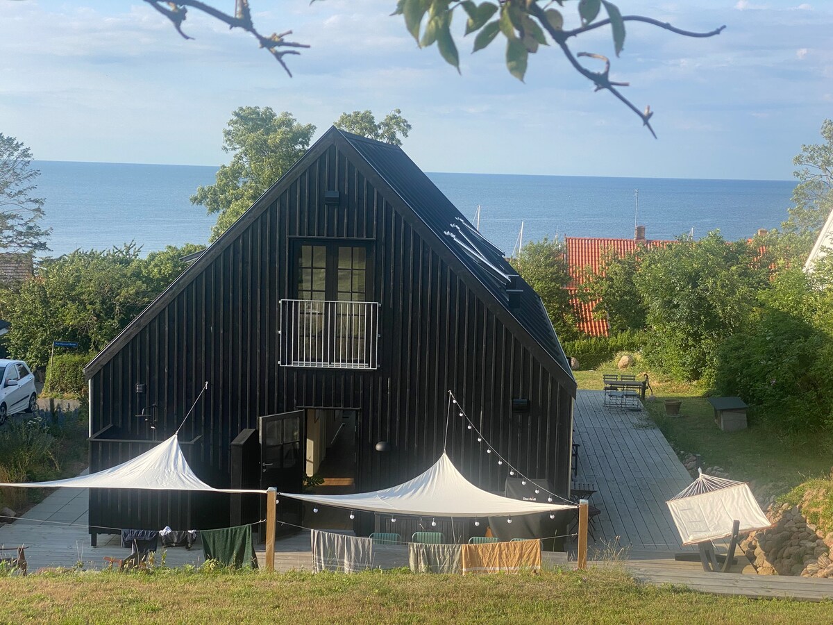 Arkitekttegnet lavenergihus i træ fra Østerlars savværk. Huset ligger hævet over Listed(Svaneke), 1 minuts gang fra badestigen på havnen og 5 minutters gang fra den smukke strand "Høl". Huset ligger ugenert og med en fantastisk udsigt over Listed, Østersøen og Christians Ø. Der er gulvvarme på begge etager, og huset er velegnet til vinterophold. Huset er allergivenligt, og kæledyr ikke tilladt. Opholdet er uden sengelinned, håndklæder etc, men kan bestilles i god tid for 200 DKK per person