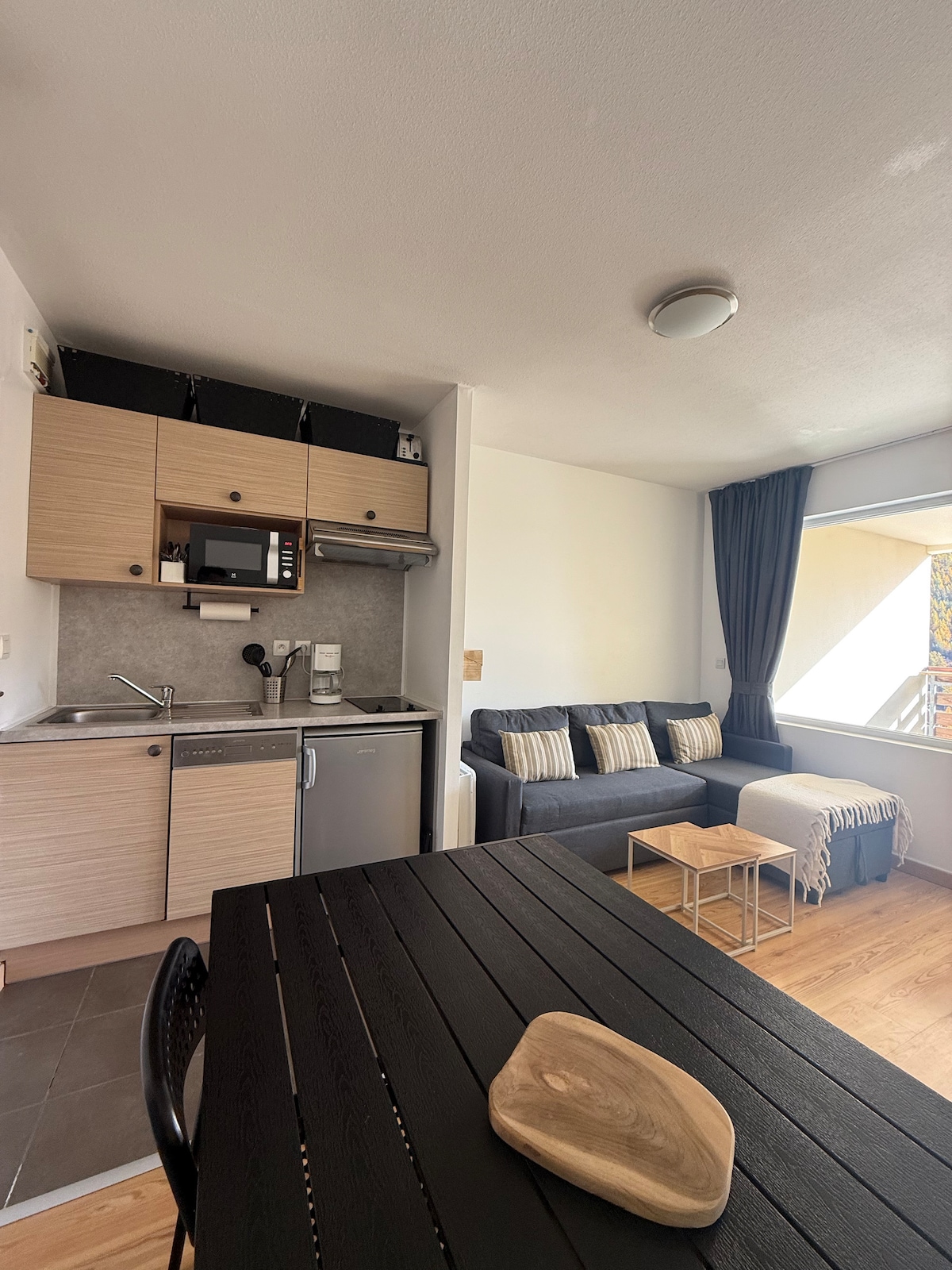 Bienvenue au Petit Nid d'Allos Nous vous proposons un chaleureux petit appartement de 30m2 refait à neuf, située à 50m des pistes et des remontées de la station du Seignus. L'espace y est confortable jusqu'à 4 personnes avec sa petite chambre et un canapé lit dans le salon, une cuisine équipée et un espace repas intérieur ainsi qu'un balcon avec vue sur nos belles montagnes du Val d'Allos.