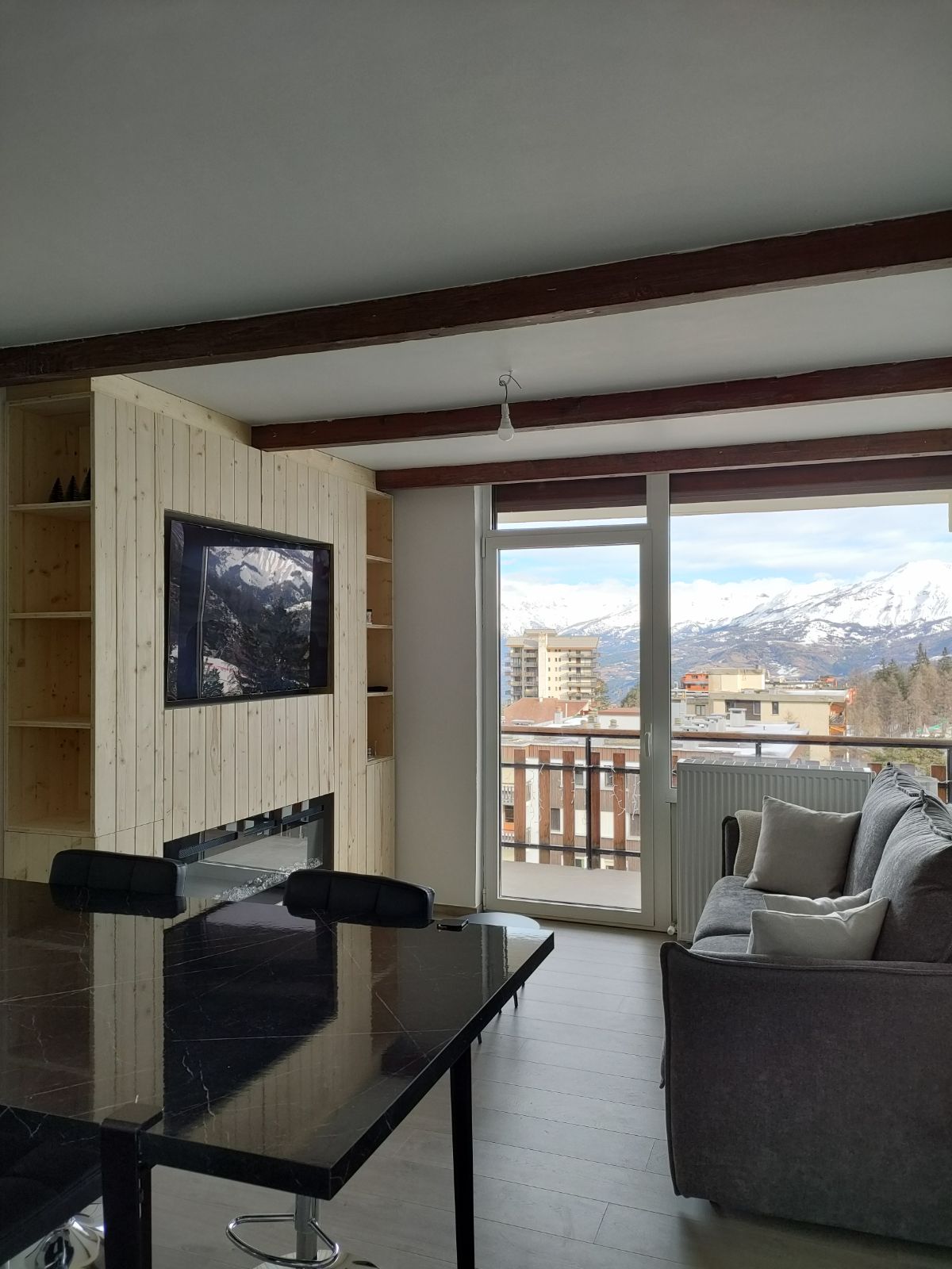 Studio spacieux , tout confort , complètement rénové, de 38 m2 avec terrasse loggia de 8 m2 ; Magnifique vue sur la montagne . Parking privé ; WIFI ; calme. Cuisine entièrement équipée ;Frigo congélateur, lave-vaisselle, plaque induction, four multifonctions, cafetière , grill-pain, appareils à raclette et à fondue; TV connectée. Coin montagne ; WC séparé. Grande terrasse loggia expo sud-ouest avec table, chaises, fauteuil relaxation, vue super. Quartier Etoiles 1800 m; au départ des pistes !