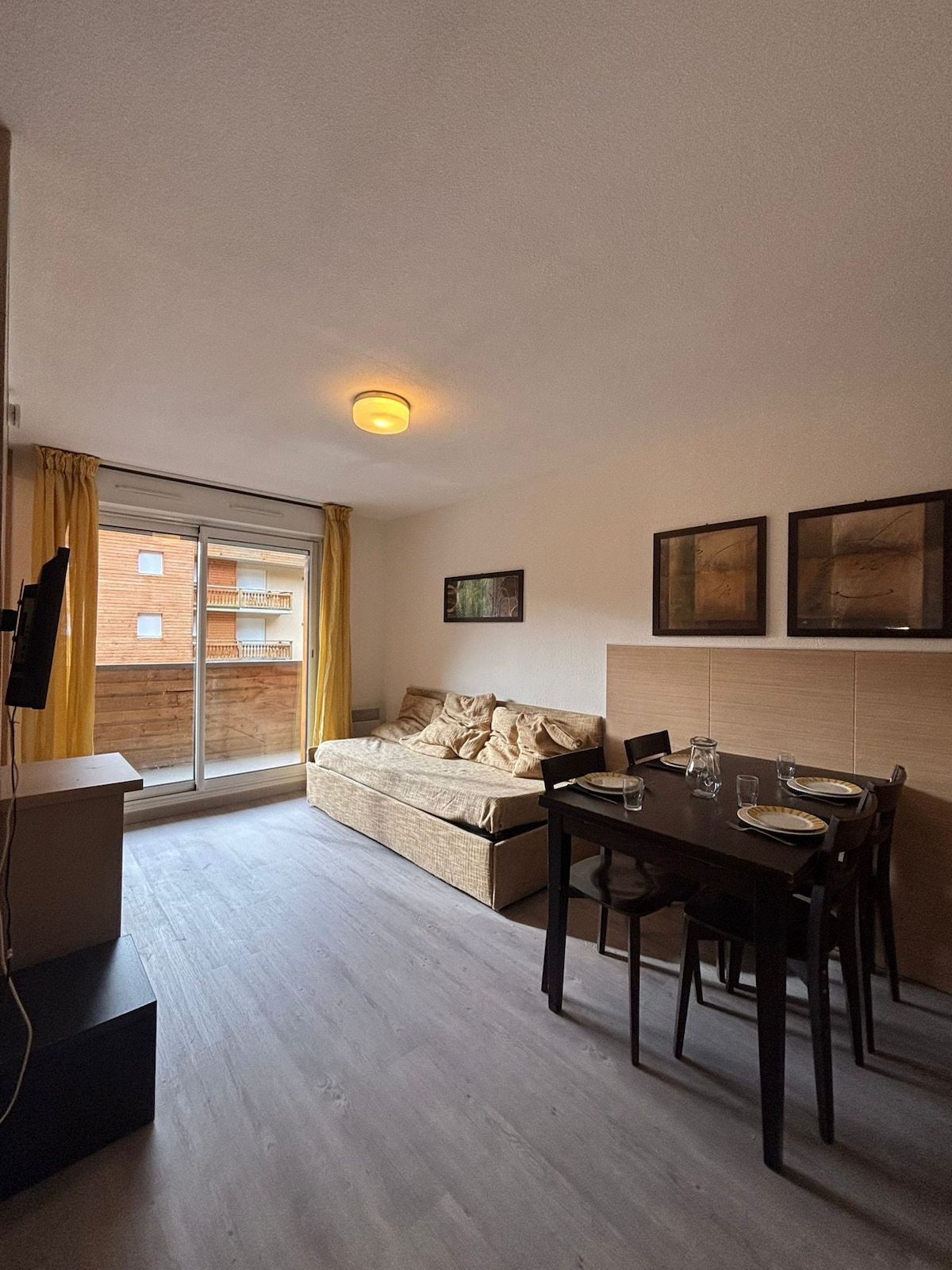 Appartement rénové pour des vacances paisibles. Situé dans la résidence des balcons du soleil, 3ème expo SUD, le soleil rentrant est apprécié été comme hiver. Idéal famille ou 4 adultes ( 1 chambre lit double et 1 chambre lits superposés ADULTES) Des cloisons et portes phoniques ont été installées pour assurer les grasses matinées. Appartement tout confort avec salon, cuisine équipées, balcon. Proche des commerces (quartier des étoiles), parking gratuit, navette bus en hiver. Animaux refusés