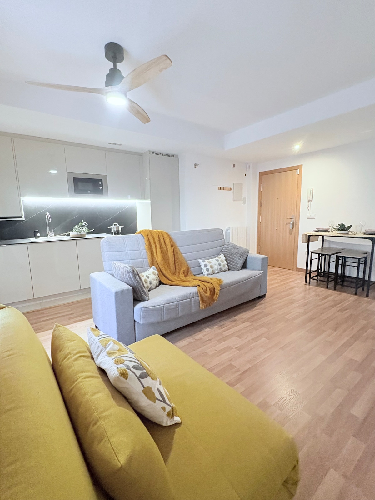 Apartamento reformado en 2020 de 50 metros bien distribuidos, máximo 4 plazas. Una habitación con cama de 150 con ropa de cama. Salón con sofá cama de 150 y cama plegable de 80, TV 50 pulgadas conectada a internet. La cocina es abierta al salón y consta de todos los electrodomésticos (todos). El baño es pequeñito, plato de ducha, secador, toallas, gel... Barrio de San Pedro muy tranquilo y a 4 minutos de las piscinas, zonas de juegos y centro urbano.