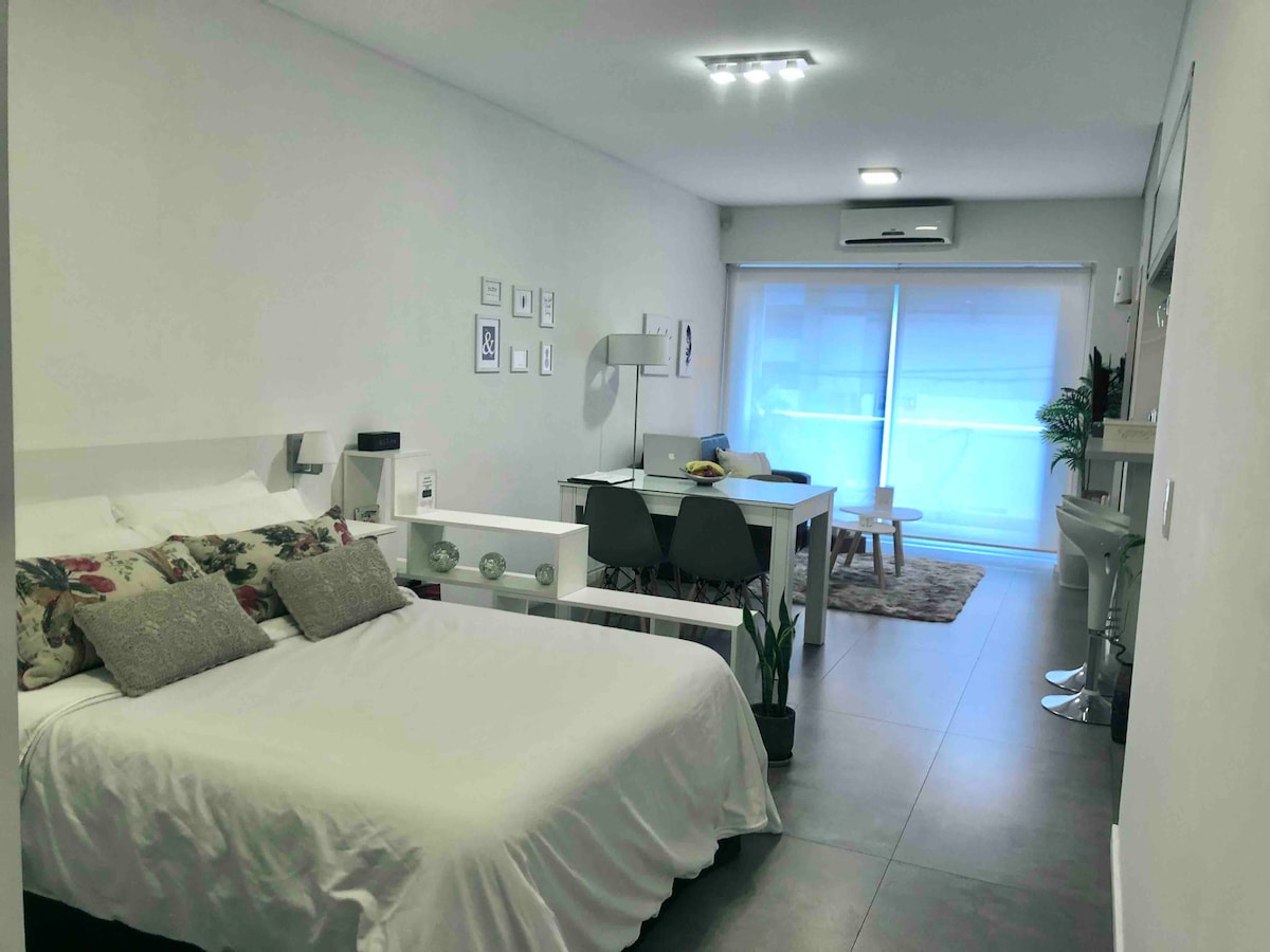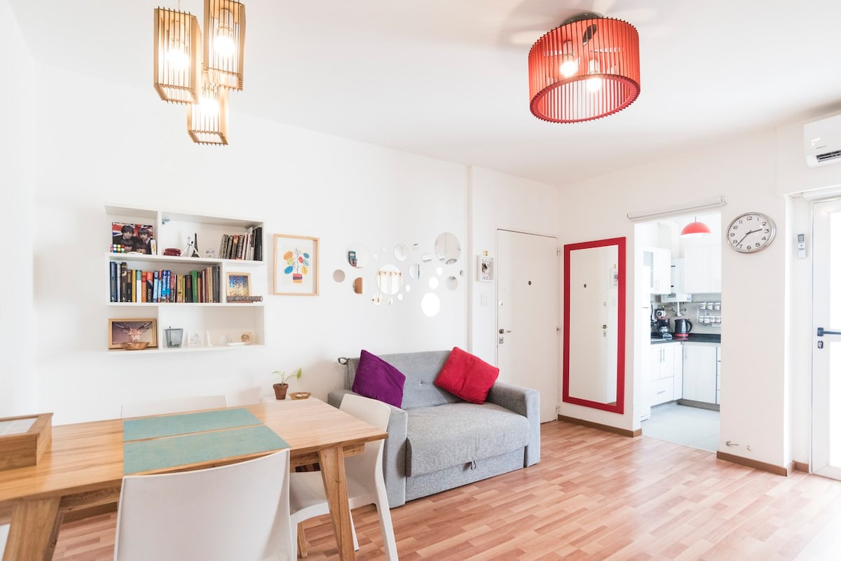 Bright, spacious and cozy apartment, right in the heart of Buenos Aires. Specially designed for your comfort, leisure and peace of mind. Fully furnished and equipped, with a large walk-in closet. Extra queen size bed, wifi, air conditioning for heating and cooling in bedroom and living room, LED TVs with cable, washing machine and fully fitted kitchen. Located on a quiet, brightly lit street in a safe neighborhood. Two blocks from a B Line.
