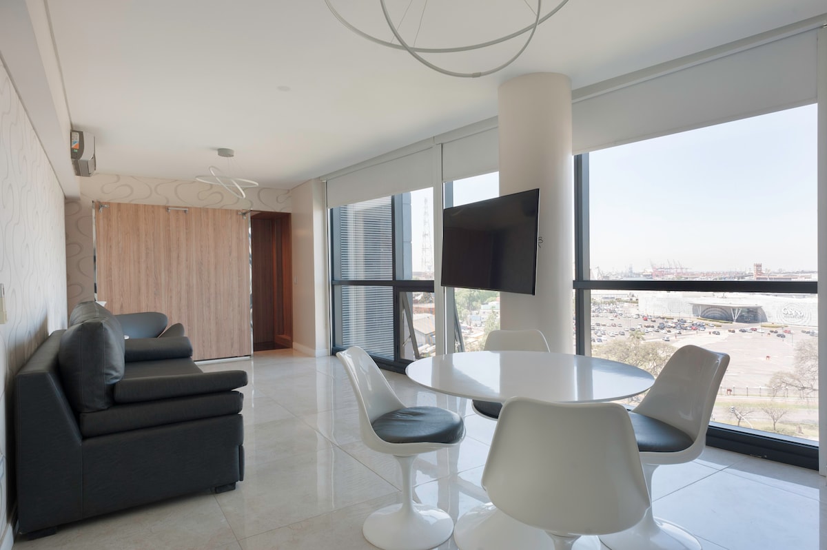 Hello, we are Marcela and Gabriel and we want to introduce you to our suite in a modern building with amenities and 24 hour security in Puerto Madero neighborhood. About us we are airbnb superhost and we invite you to see our profile where you will find more than 200 positive reviews that describe our service. Modern modern studio of 38 m2 with spectacular window with a good view of the port and canal view in a complex in Puerto Madero.