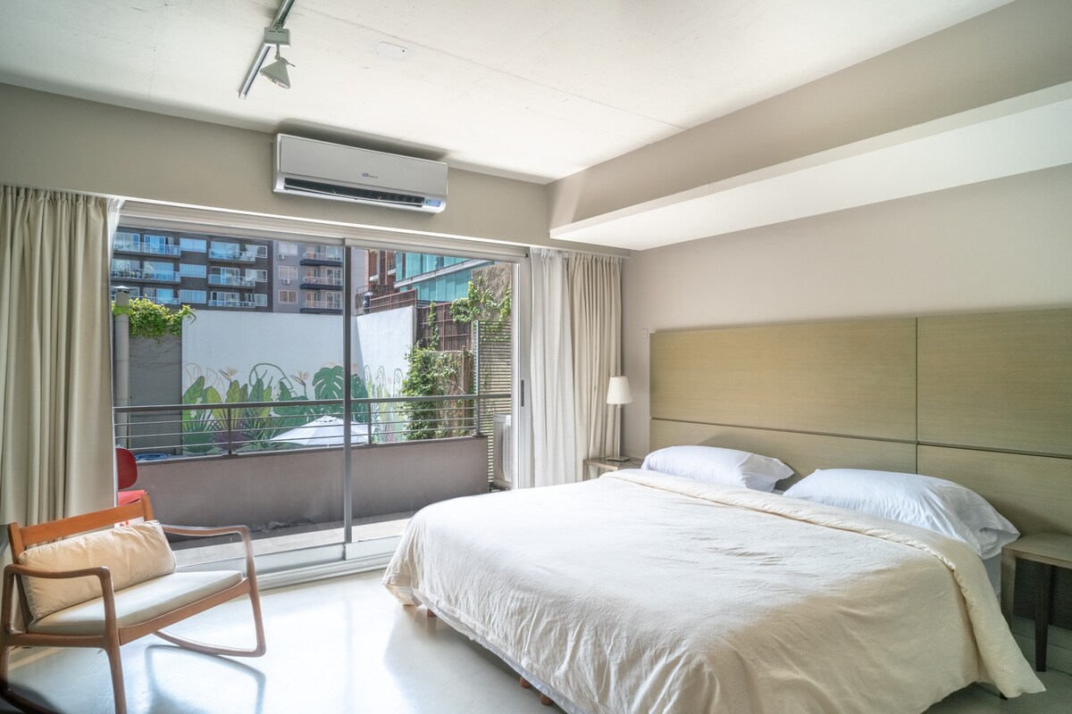 Loft luminoso y muy funcional para 2 o 3 personas en la mejor zona de Palermo y a 2 cuadras del subte. Amplio balcón, lavarropas y secarropas, aire acondicionado y todo completamente equipado para asegurar que tengas la mejor experiencia. Very luminous and functional Loft for 2 to 3 people at the heart of Palermo and 2 blocks away from the subway. Large balcony, washing and drying machines, AC, fully equipped for you to have the best experiencie possible.