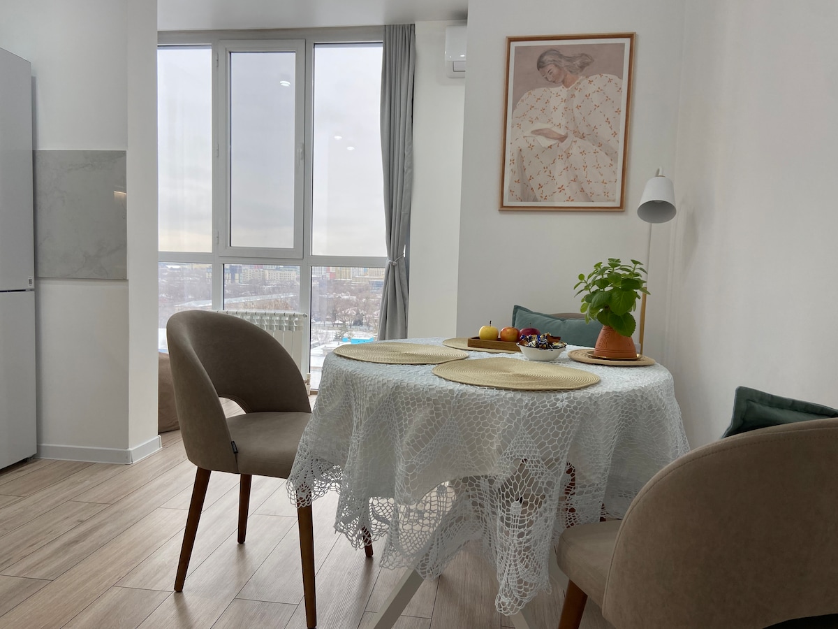 Welcome to your ideal stay in Almaty! Enjoy breathtaking mountain and city views right from your window. -7 minutes to Metro Station -сomfortable bed and cozy sofa -fully equipped kitchen -modern bathroom with fresh towels and toiletries - Wi-Fi and SmartTV The apartment is located in a safe and lively district, close to cafés, supermarkets, pharmacies, shopping malls! Self-check-in available Always ready to assist you — feel free to message any time. Relax, explore, feel at home!