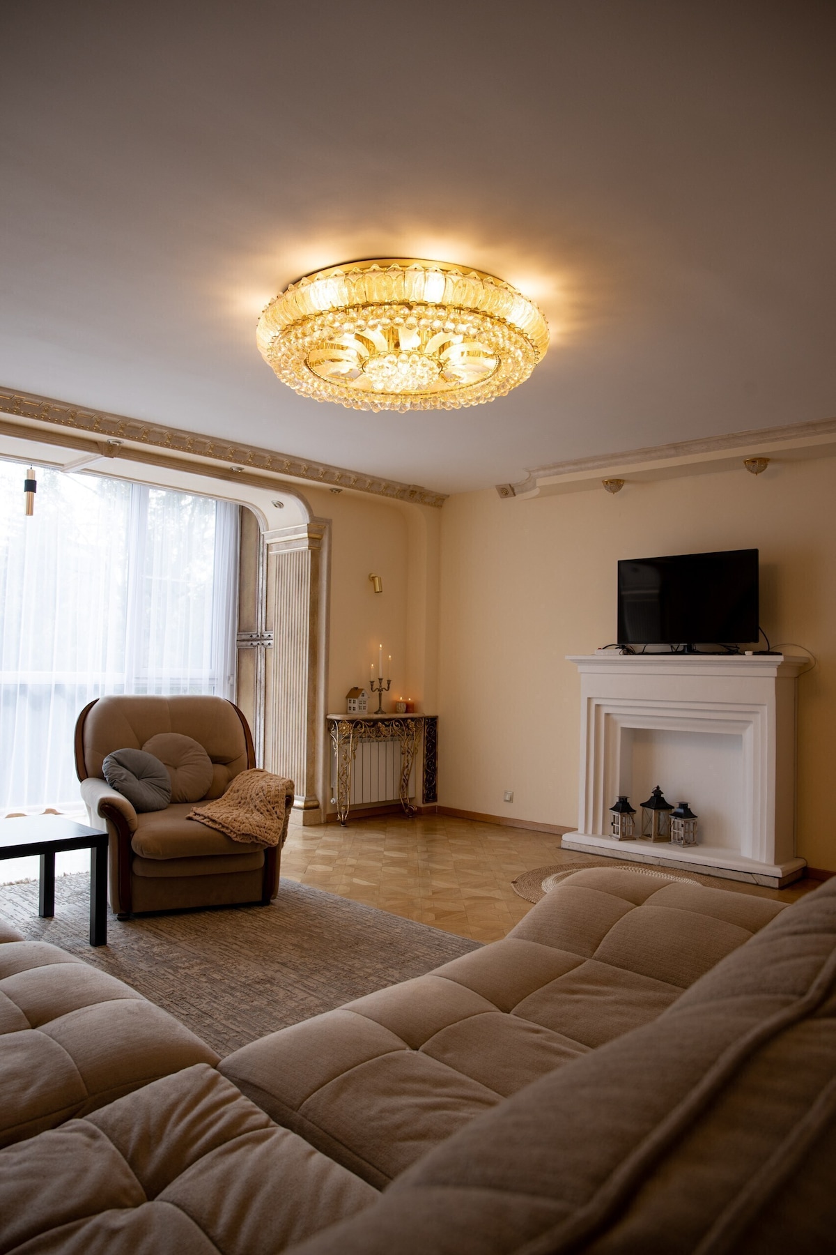 Imagine stepping into an Airbnb apartment located in an old Stalin-era building, where neoclassic style is elegantly embraced. The exterior of the building boasts the grandeur of the Soviet era, with imposing architecture characterized by sturdy construction and symmetrical lines. As you enter the apartment, you are greeted by a yellow entrance with neoclassical moldings which leads into the kitchen and living room with stunning chandeliers hanging from high ceilings. there is no elevator 🛗
