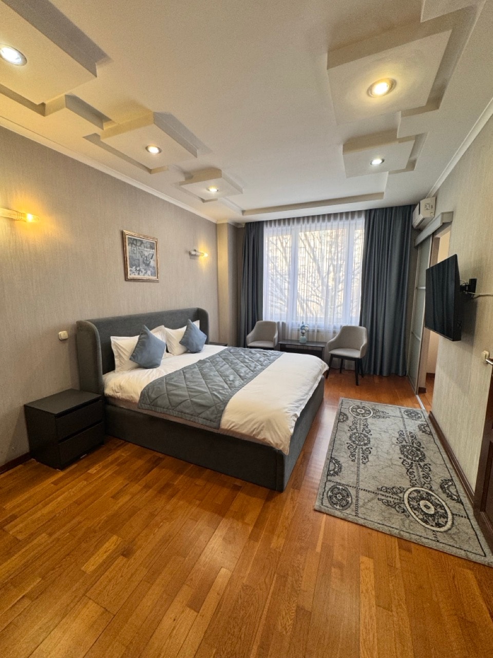 Welcome to a bright 2-bedroom, 2-bath apartment in Almaty’s Golden Square secured residence, 20 minutes ride from the airport. Fine restaurants, supermarkets, and attractions are steps away. Thoughtfully designed with natural wood and ceramic floors, it stays cool in summer and warm in winter. It has calm and elegant vibe. The apartment features layered lighting, a workspace, washing machine, Nespresso machine and dishwasher. Breakfast available for an extra fee — perfect after a long trip.