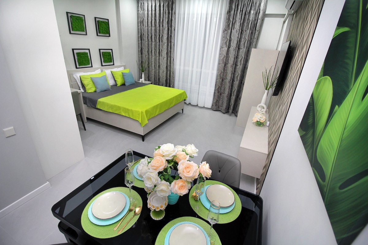 알마티 시내 근처에 있는 조용한 주택가 입니다. 침실1개와 거실이 별도로 있으며, 거실에도 2인이 취침할 수 있는 소파 침대가 있습니다. 욕실에는 욕조와 화장실, 세탁기가 있습니다. 부얶은 내부에 시설되어 있습니다 우리는 외국인 여행자를 위한해 항상 청결한 침구를 제공합니다. 친구, 커플, 가족을 위한 휴식과 관광을 즐기세요. 알마티의 효율적인 관광 정보와 합리적인 가격의 업체를 알려 드릴 수 있습니다.