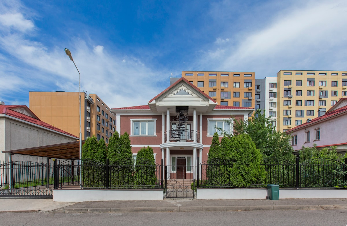Large beautiful bright new house, located in a picturesque area near the mountains of Almaty. There are equestrian clubs, shopping centers, parks and cafes nearby. The house has 6 bedrooms, 4 bathrooms, a tennis table, a sauna, 2 full kitchens. Fiber-optic Internet, air conditioning, generator. We will be waiting for our guests.