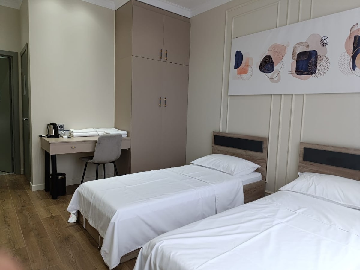Наш объект расположен почти в центре Алматы, рядом с проспектом Абая, метро и остановками транспорта, что позволяет быстро добраться в любую часть города. Поблизости — парки, бизнес-центр и клиника. Современные номера оснащены всем необходимым: удобные кровати, рабочая зона, кондиционер, ТВ и Wi-Fi. Для гостей доступна прачечная. Предоставляется завтрак. Особое внимание уделяем чистоте, сервису и комфорту гостей.