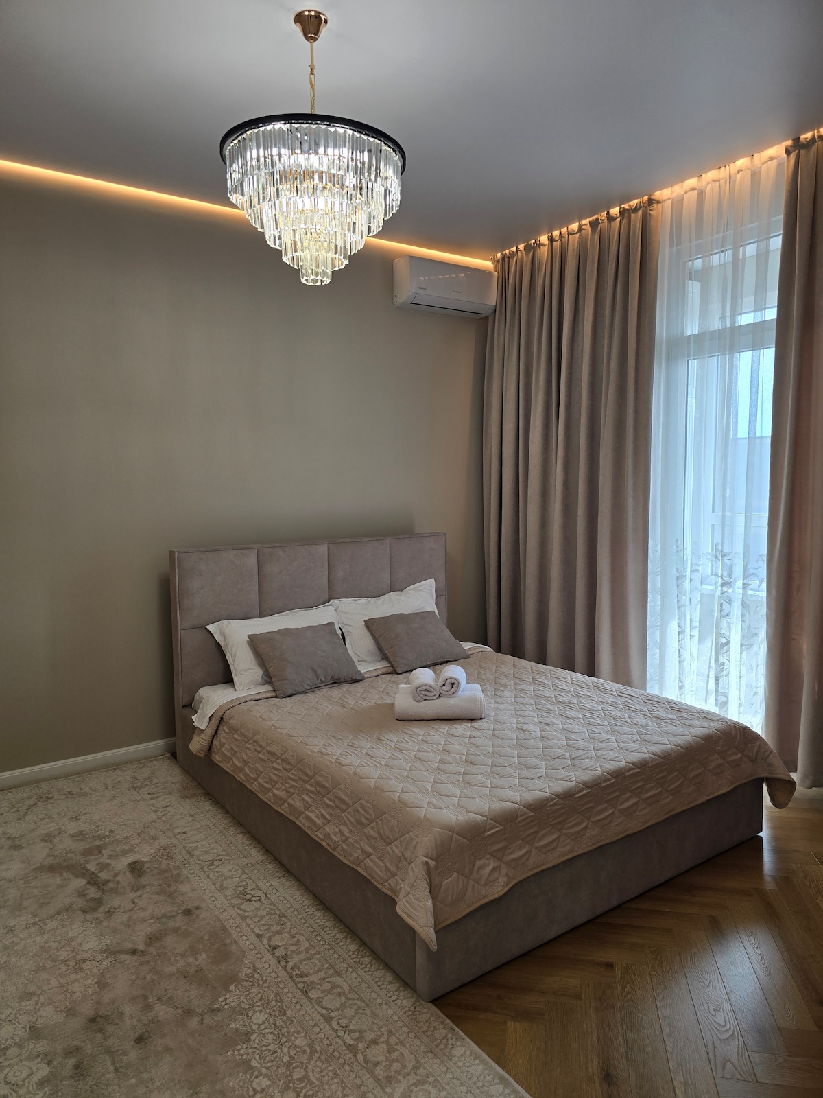 Стильная квартира в самом сердце Алматы — на набережной Esentai, рядом с Esentai Mall, парком и лучшими ресторанами города. Уникальная фреска, уютный камин, дизайнерский декор и вид на горы с 4 этажа создают атмосферу уюта и вдохновения. Полностью оборудованная кухня, техника, винные бокалы и редкие сорта чая. Для гостей при бронировании от 5 ночей — бутылка казахстанского вина Arba Wine в подарок. Пространство 48 м² идеально подойдёт для пары, творческой поездки или путешествия в одиночку.