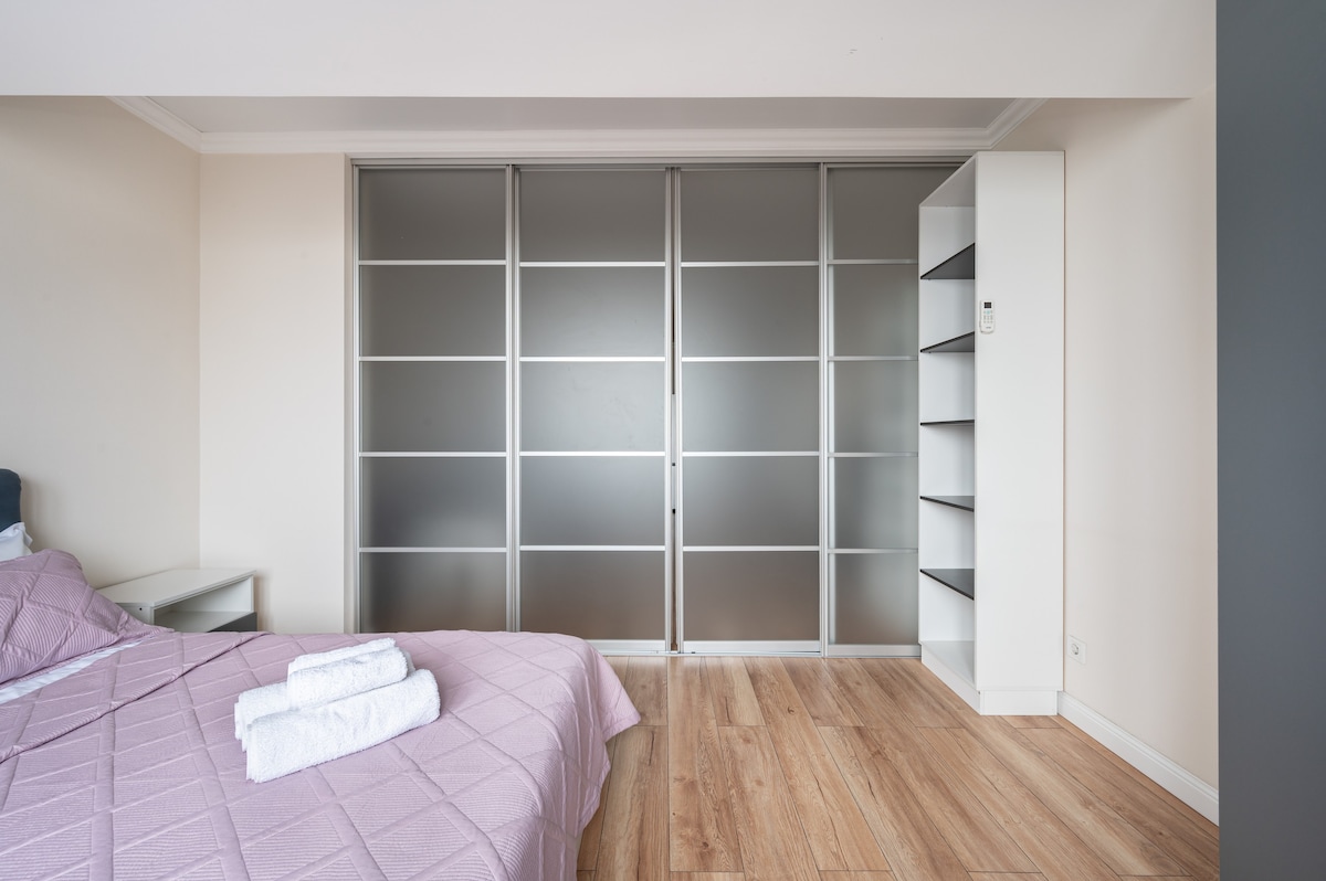 The best location to feel vibe of Almaty. The very center where everything is within walking distance! Near the shopping center, cafes, cinemas, 28 Panfilov's park, Gorky park, Zoo, Green Bazar, symphony, opera, etc. The amenities: dishwasher, washing machine, coffee machine, air conditioning, TV, 2 internet providers Kazaktelecom 500mb & AlmaTV 100mb, iron and SMART-LOCK. Towels and shower accessories are provided for all guests.
