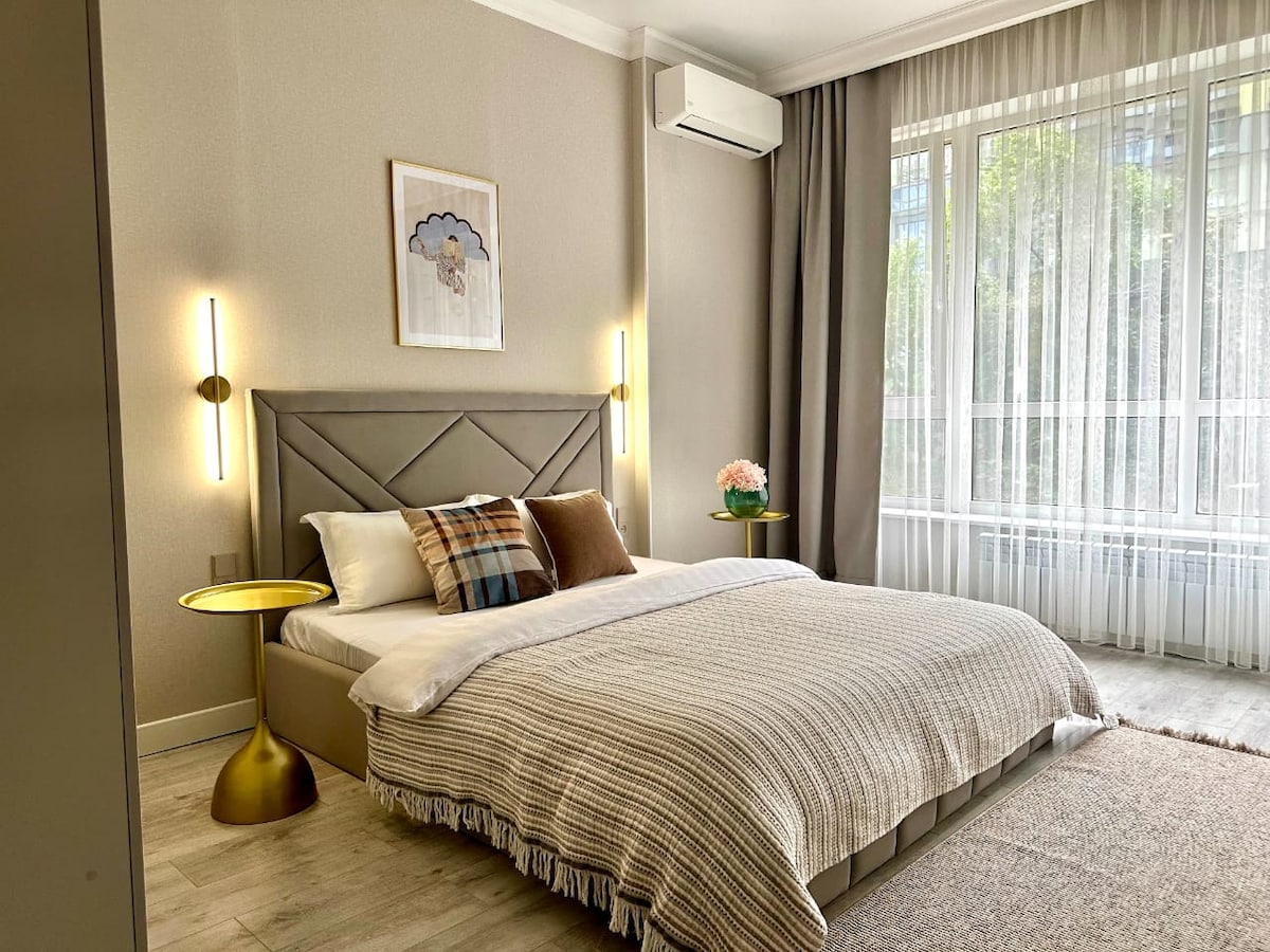Welcome to your ideal stay in Almaty! Enjoy breathtaking mountain and city views right from your window. -7 minutes to Metro Station -сomfortable bed and cozy sofa -fully equipped kitchen -modern bathroom with fresh towels and toiletries - Wi-Fi and SmartTV The apartment is located in a safe and lively district, close to cafés, supermarkets, pharmacies, shopping malls! Self-check-in available Always ready to assist you — feel free to message any time. Relax, explore, feel at home!