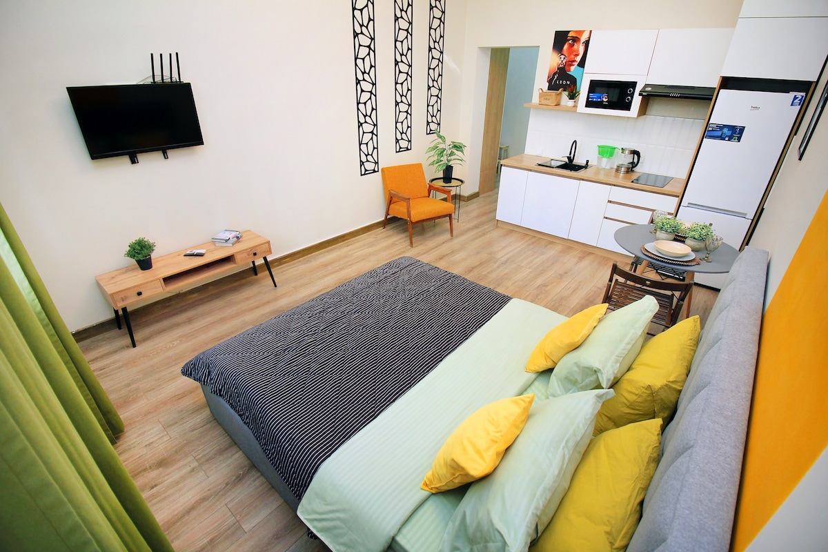 Дофаминовая квартира в центре города! Отличное место для комфортного проживания: • Просторная и светлая гостиная с высокими потолками. • Оборудованная кухня для тех, кто любит готовить. • Уютная спальня с шикарным видом на город. • В нескольких минутах пешком — магазины, кафе и рестораны, парки, пешеходные улицы. Мы создали это пространство, чтобы вы чувствовали себя как дома, а городской ритм был всегда рядом.