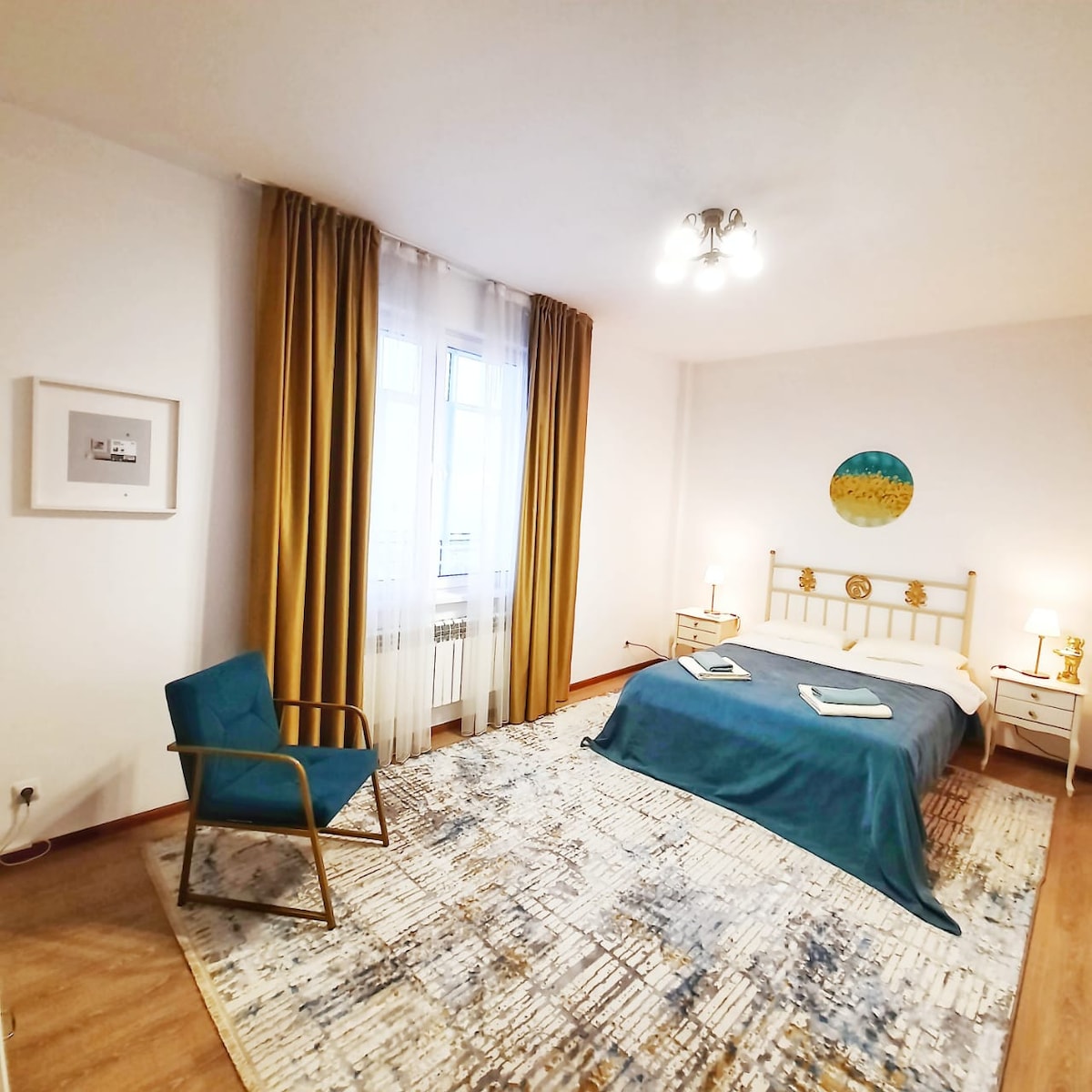 Мы часто путешествием сами арендуя апартаменты и очень ценим жильё, где всё продумано до мелочей для удобства гостей. Мы постарались использовать весь наш опыт обустраивая квартиру, чтобы вы себя чувствовали как дома. Новая, чистая, уютная квартира полностью укомплектована бытовой техникой, посудой и спальными принадлежностями. Рядом расположен центральный парк. В пешей доступности колоритный восточный базар, магазины, кафе, аптеки, остановки общественного транспорта. Интернет 5G, 3000 Каналов