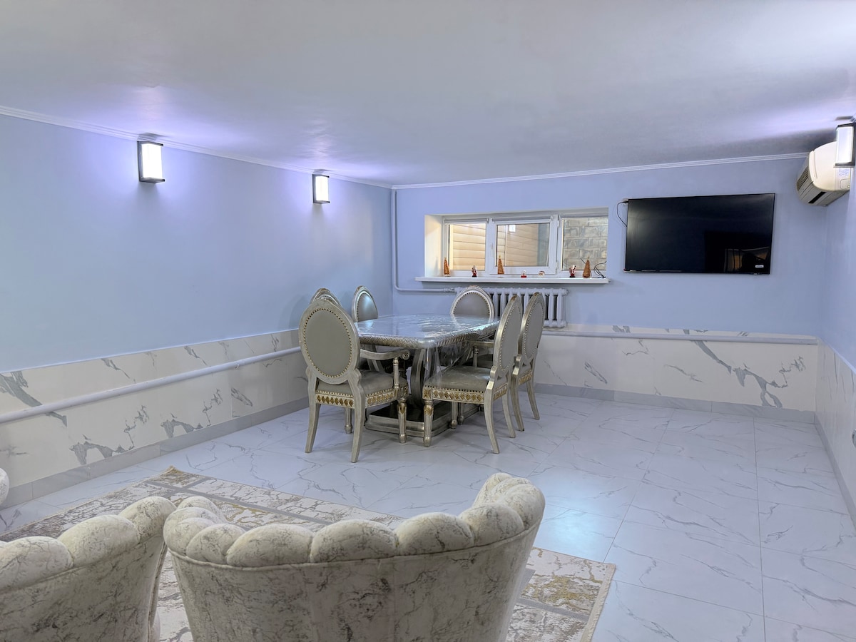 • Spacious two-level house • 3 large separate bedrooms • Each bedroom has a king-size bed • Comfortable and bright living room • Fully equipped kitchen: • microwave • oven • stovetop • refrigerator • washing machine • dishes and kitchen essentials • 3 bathrooms with full-size bathtubs • Wide and bright hallways • Outdoor barbecue area (mangal zone) • Private parking space • Wi-Fi • Air conditioning in rooms • TV available • Ideal for families and groups