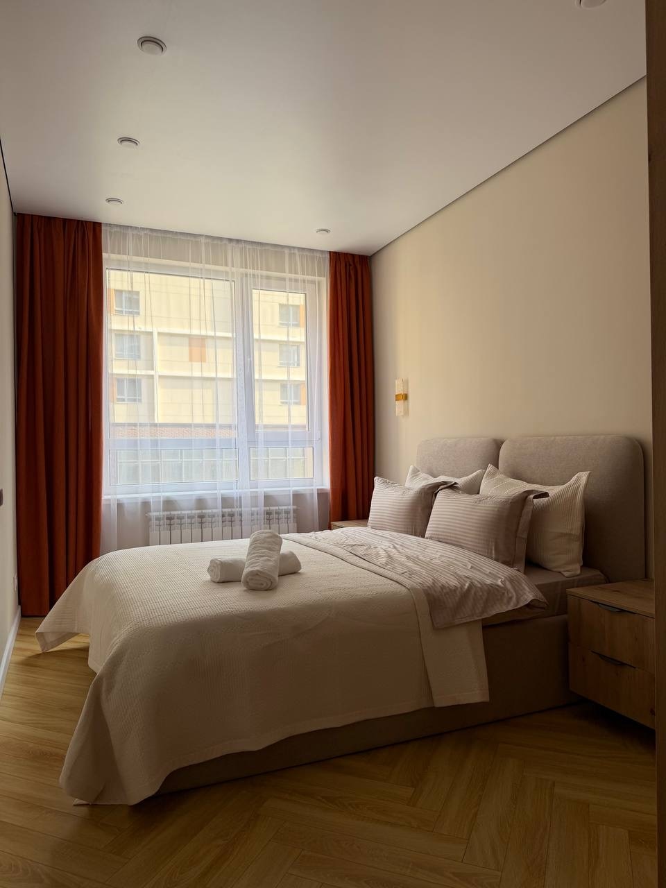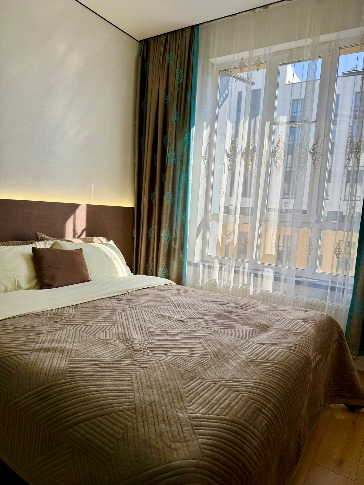 Один из лучших вариантов проживания в этом комплексе! Идеальная чистота и комфорт! Квартира оснащена шкафом для одежды, стиральной машиной, сушилкой для одежды, собственной ванной комнатой с душем в квартире также высокоскоростной, телевизор-смарт с диагональю 49 дюйма, удобные ортопедические матрацы, шторы black-out. Вы можете готовить как дома, кухня оснащена приборами первой необходимости. Квартира расположена на 9 этаже нового жилого комплекса