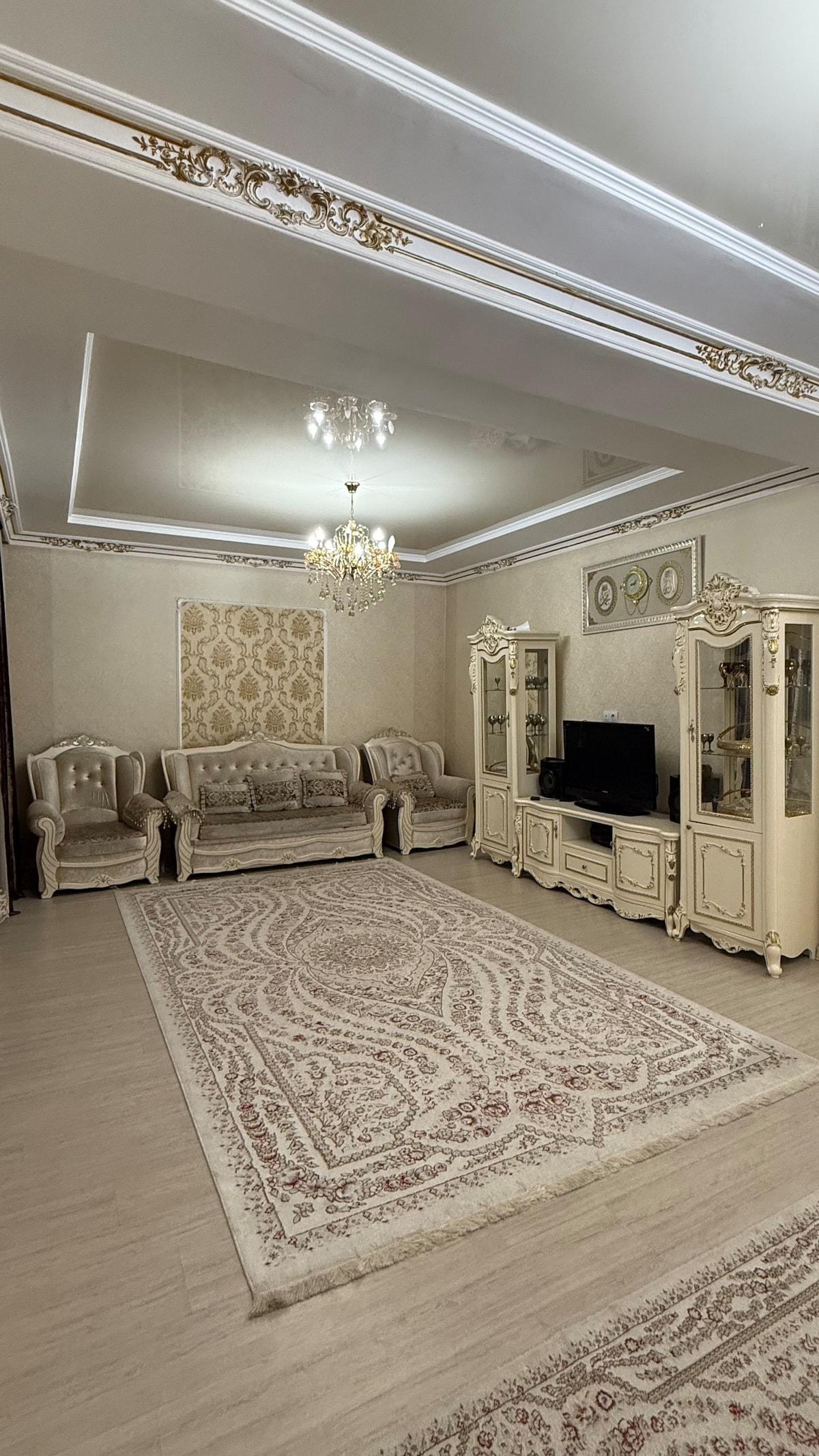 Welcome to a bright 2-bedroom, 2-bath apartment in Almaty’s Golden Square secured residence, 20 minutes ride from the airport. Fine restaurants, supermarkets, and attractions are steps away. Thoughtfully designed with natural wood and ceramic floors, it stays cool in summer and warm in winter. It has calm and elegant vibe. The apartment features layered lighting, a workspace, washing machine, Nespresso machine and dishwasher. Breakfast available for an extra fee — perfect after a long trip.