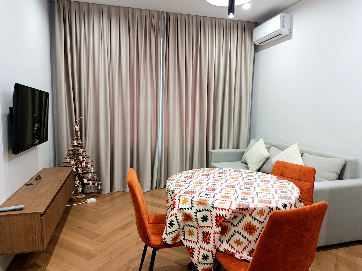 Modern and comfortable apartment in best central area Golden Square. Ideal 4 1st time visitors: safe, walkable neighborhood with the city’s top attractions nearby. Walk to Arbat street, Panfilov Park, Green Bazaar, cafés and restaurants no taxis needed. Fully equipped Nespresso, AC, TV, washing machine, kitchen with full cookware and iron. Fast Wi-Fi with 2 providers. Smart lock with easy 24/7 self check-in. Towels, slippers and toothbrushes included. Perfect for tourists and business travelers.