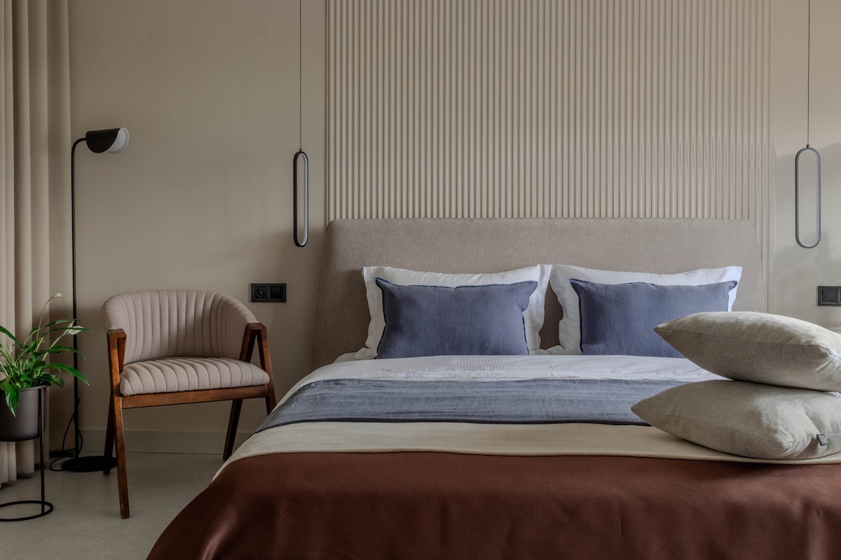 Welcome! We’re proud to offer one of the best guest experiences in the city. INDIGO is a designer apartment created for guests who appreciate architectural precision, calm luxury, and a refined living environment. Every element of the space is thoughtfully designed to support focus, comfort, and a sense of effortless order. Located in the Rams City residence, INDIGO offers privacy, security, and panoramic views, making it ideal for business travel, special occasions, or a quiet high-end stay.