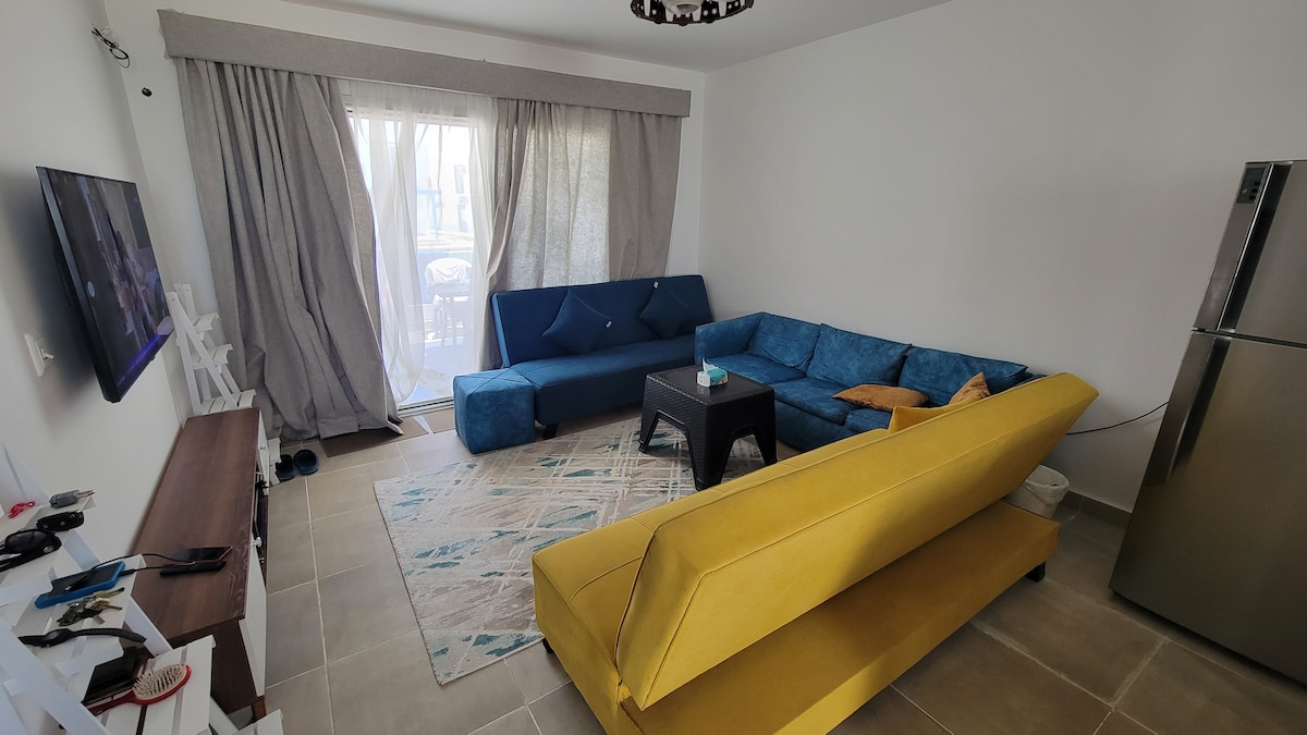 Escape city & welcome to beach life Located in the north coast, Almaza. Our Summer house offers: • Summer house • Few steps away to bay (beach) • Outdoor balcony seating • 2 minute away to Almaza Village • boho summer style apartment • Modern Furniture • Smart TV • Fast WI-FI • New Appliances & AC • Open & fully equipped kitchen • Washing machine & dryer • Self-Check-in • Quiet and convenient spot • 24/7 Guest Support • Garage Parking Spot Housekeeping on demand No visitors & No parties