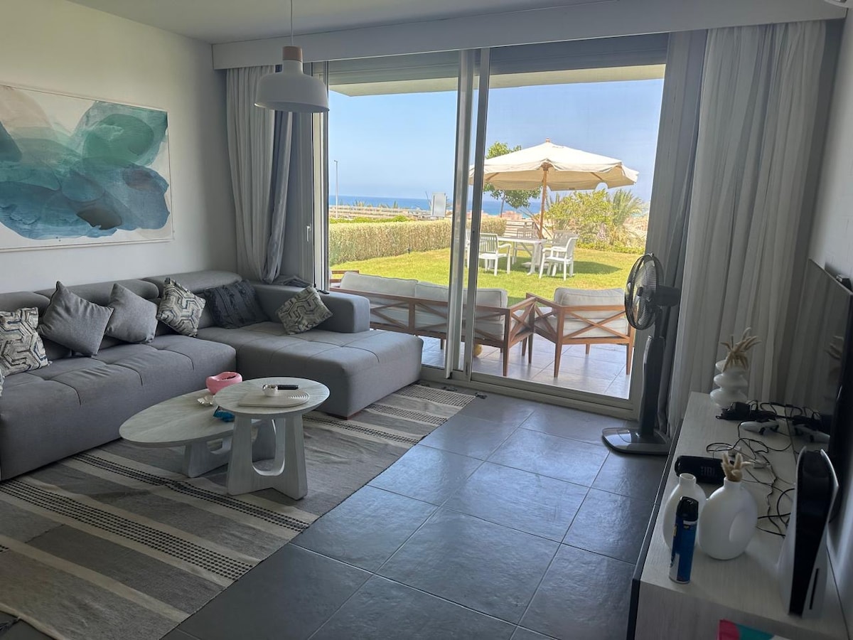 Modern 3BR/2BA ground floor chalet in Corfu, Mountain View Ras El Hekma. Fully furnished with sea view, private garden, terrace, and open-plan kitchen. Features a master ensuite, two twin bedrooms, and a sofa bed in the lounge. Just steps from the pool and a 5-min walk to the beach. Fully air-conditioned and ideal for families or groups. Peaceful area with restaurants and shuttle access. Beach access: 2,000 EGP/adult/week paid to MV on arrival.