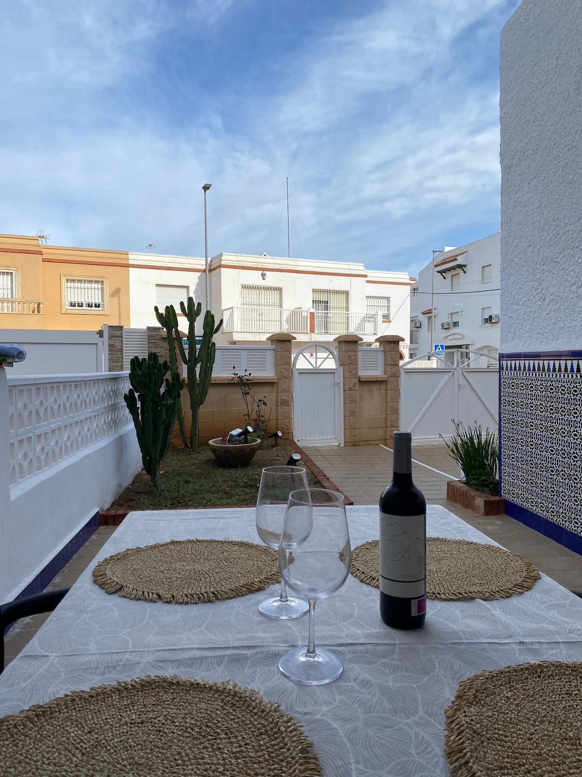 House with direct access to the beach of Mojacar. It has 3 double bedrooms, 2 bathrooms, equipped kitchen and large living-dining room. Garden ideal for sunbathing or outdoor dining. Shared parking for 2 cars. Located in a quiet area, close to restaurants. Perfect for families or groups looking for comfort, charm and an unforgettable vacation by the sea. **Cleaning fee: 100€, to be paid on arrival.