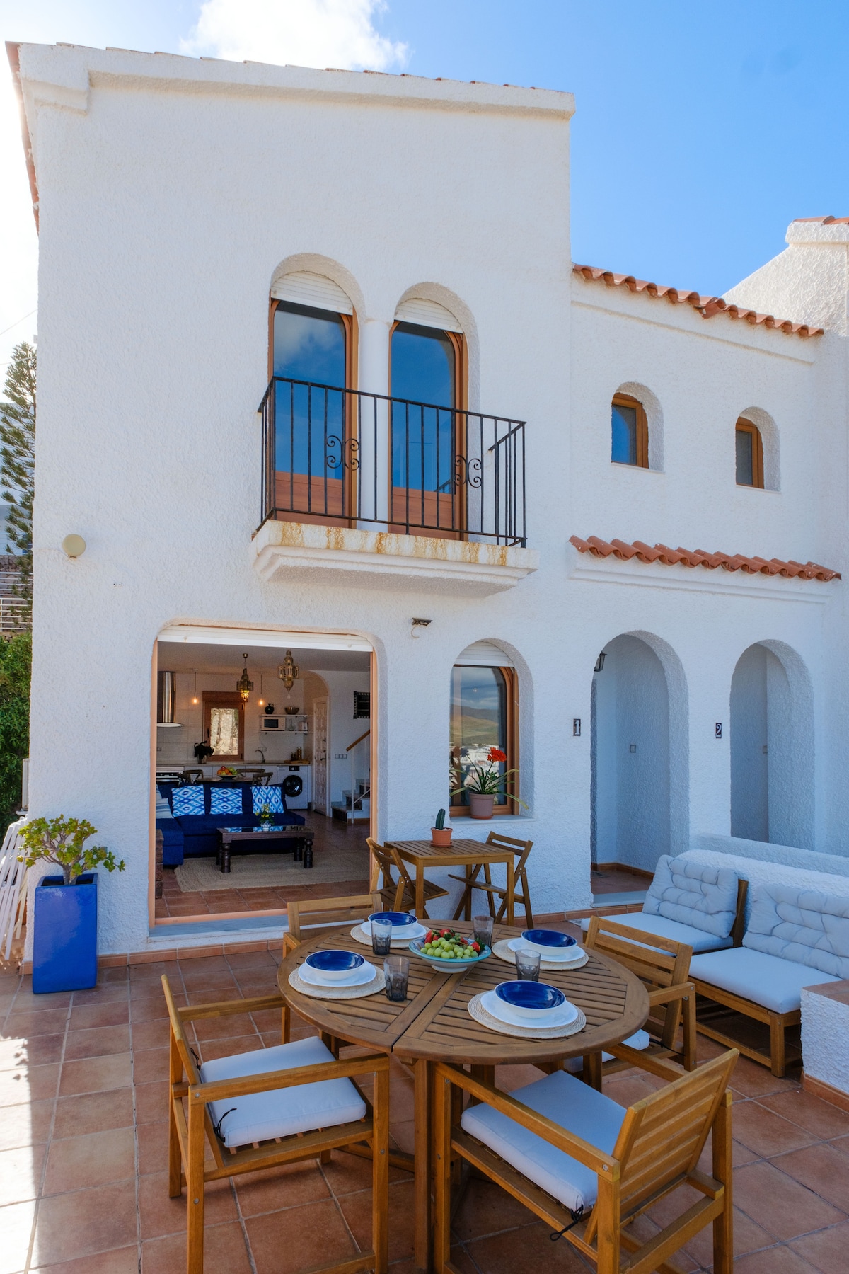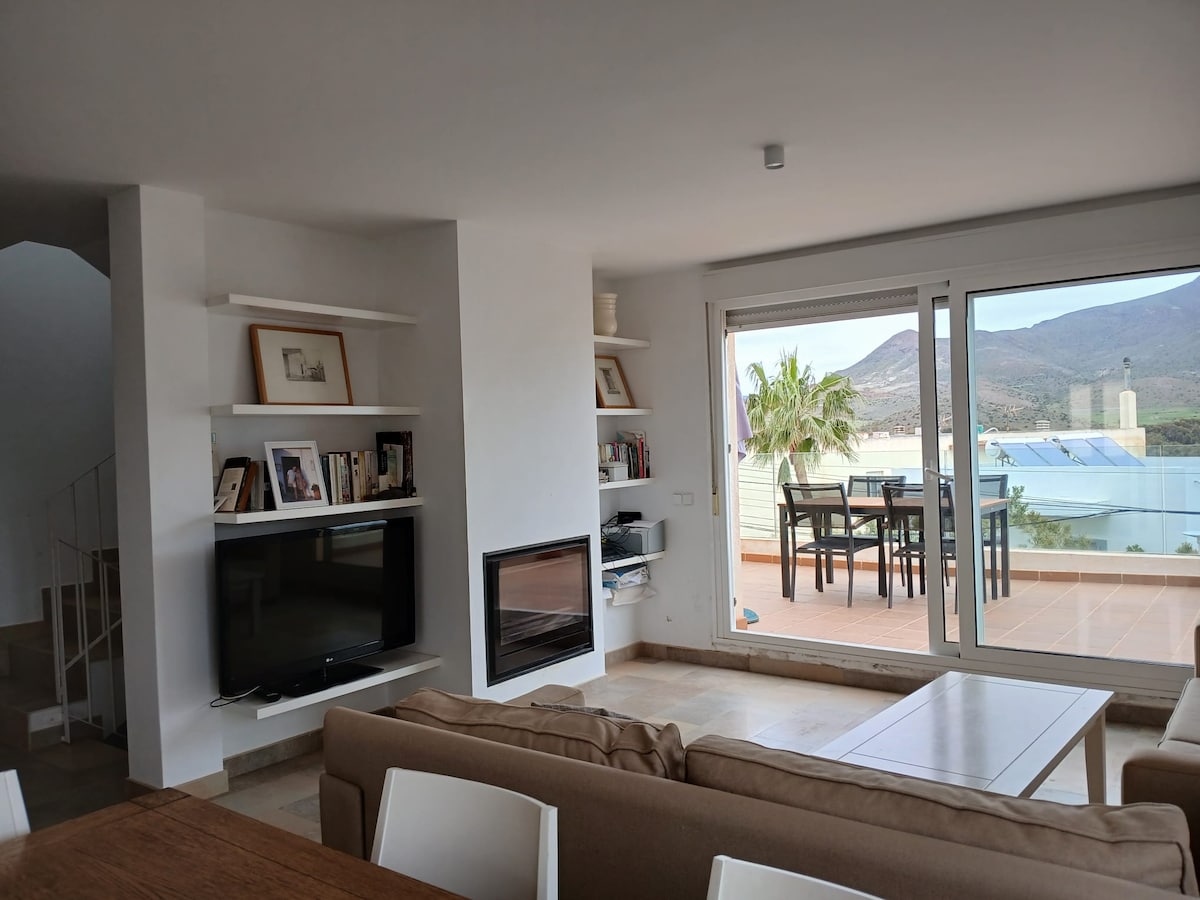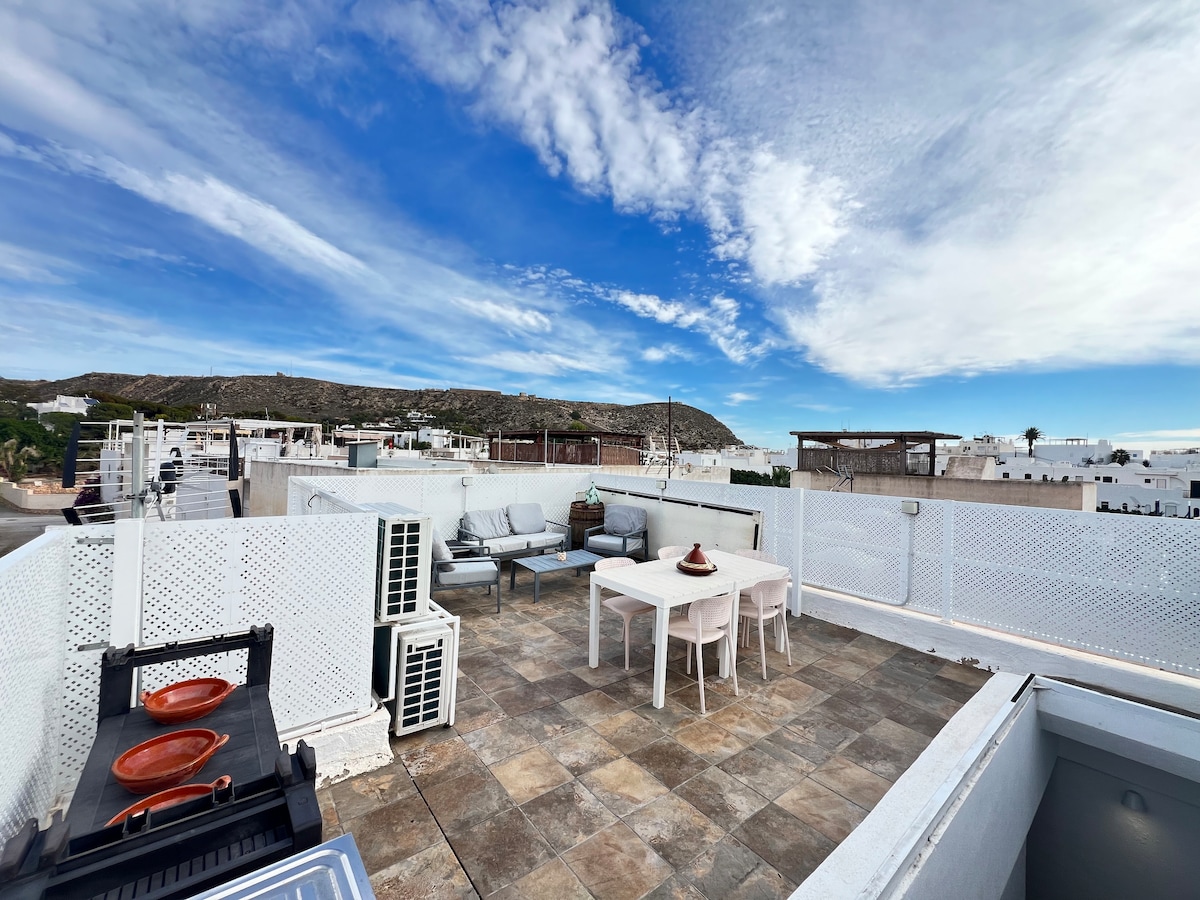 House with direct access to the beach of Mojacar. It has 3 double bedrooms, 2 bathrooms, equipped kitchen and large living-dining room. Garden ideal for sunbathing or outdoor dining. Shared parking for 2 cars. Located in a quiet area, close to restaurants. Perfect for families or groups looking for comfort, charm and an unforgettable vacation by the sea.