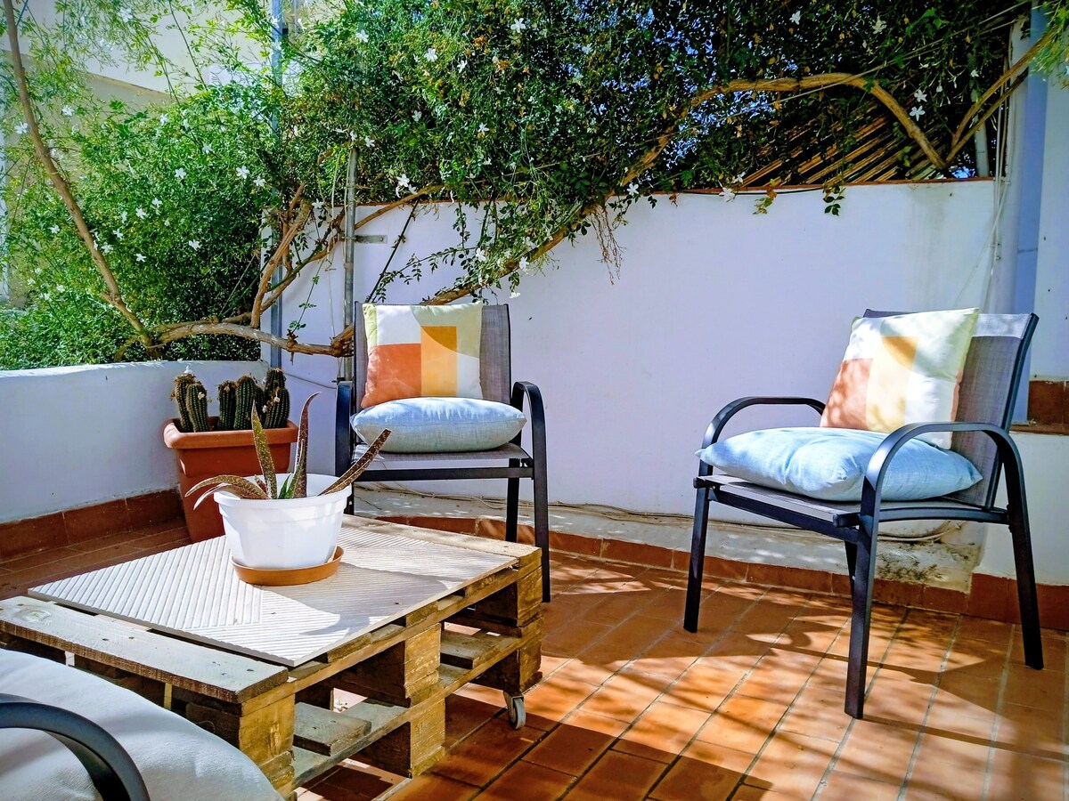 POR FAVOR, ANTES DE RESERVAR LEE LA DESCRIPCIÓN Y LAS "NORMAS DE LA CASA". Vivienda rural para 2, situada en el semisótano de una casa de dos plantas que dividí en dos apartamentos. Cada apartamento tiene su propia puerta de entrada y terraza privada. Las playas están a solo 25 minutos. En verano evitas la masificación que se produce en la costa. Y también, a diferencia de la costa, encontrarás todos los servicios: bancos, farmacias, centro de salud, supermercados, bares, tiendas artesanía etc