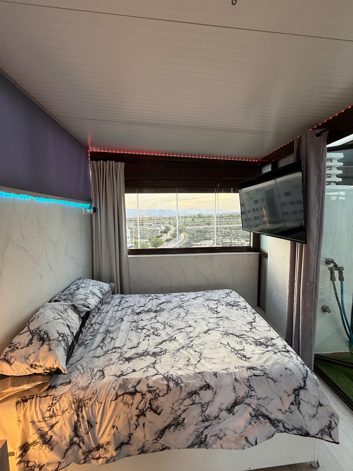 Este ático cuenta con una terraza de 90m² dividida en dos niveles. Disfruta de una cocina equipada, acogedor salón, y habitación con cama de matrimonio y acceso a la terraza inferior. La terraza superior es un paraíso con zona chill-out, tumbonas, jacuzzi (sin calefactor) y barbacoa de metal. A solo 2 min en coche de la playa y 5 min de tiendas y farmacias. Relájate con vistas a las Salinas de Cerrillos y atardeceres sobre Sierra Nevada.