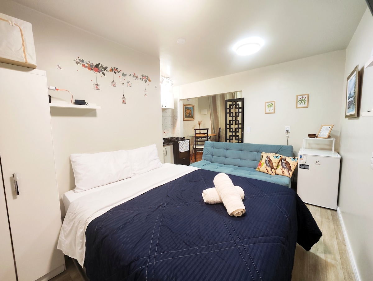 Studio Passarinhos é um espaço familiar, acolhedor e silencioso, em região residencial tranquila, onde se ouve o canto dos pássaros. Possui cama de casal, sofá-cama, banheiro privativo, cozinha equipada para refeições simples e VAGA DE ESTACIONAMENTO PRIVATIVA + ENXOVAL COMPLETO. Acomoda até 3 hóspedes, com possibilidade de berço. Localizado na região norte de Curitiba, a cerca de 20 min. do centro, fácil acesso à Pedreira Paulo Leminski (1,1 km), além da Ópera de Arame e parques da cidade.