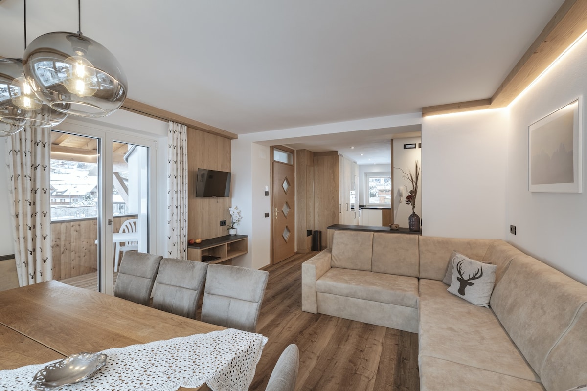 Our light-flooded apartment is fully equipped, and features a private south-facing balcony with a unique view. Thanks to the central location of the chalet, you can start your holiday activities in summer as well as in winter directly from the accommodation by foot. Afterwards, treat yourself to a few hours of relaxation in the private sauna in your chalet or end the day on the couch with a glass of wine and a view through our panoramic windows.