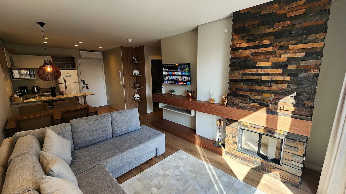 O Flat é totalmente mobiliado, com lareira na sala, cozinha completa, TV a cabo, ar-condicionado quente e frio, banheira com hidromassagem e roupas de cama e banho incluídas. A decoração moderna e o padrão de hotel com toque de lar criam o cenário ideal para dias de descanso e aconchego.