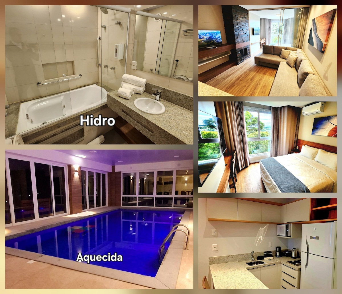 Apartamento novo no Serra Class em Canela composto de 1 quarto com cama casal, sala com lareira e cozinha integrada. Sala com sofá cama e a possibilidade de colchão extra, podendo assim o apto acomodar até 5 hóspedes. Garagem disponível para 1 automóvel. Piscina aquecida acessível a todos os hóspedes.