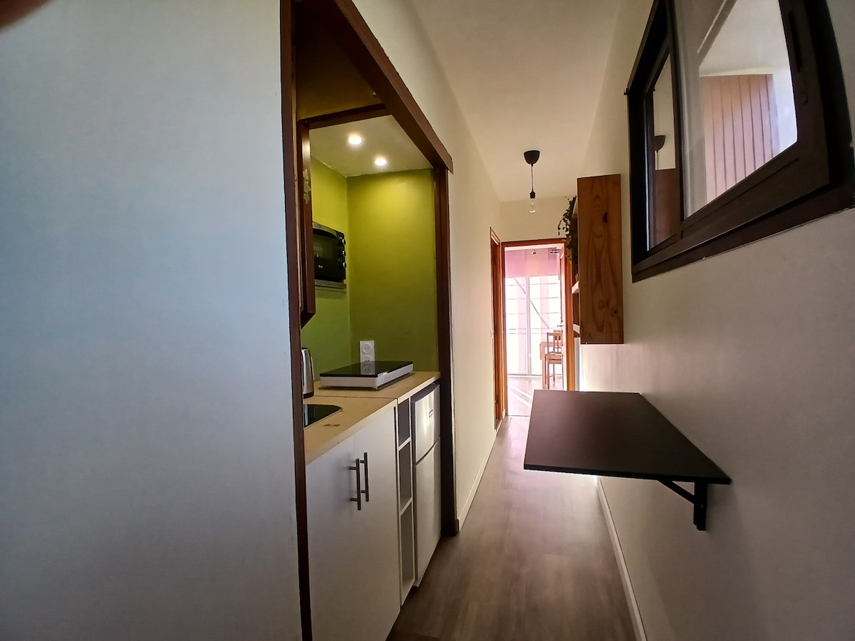 Mini studio avec tout d'un grand :-) Entrée indépendante d'une grande villa, petit studio en superficie mais très fonctionnel avec bz très confortable, penderie, vrai cuisine équipé, table et chaise pliante pour le repas à l'intérieur ou l'extérieur, salle d'eau indépendante avec douche, lavabo et cuisine, et même une fausse cheminée animée lol Parking et wifi gratuit