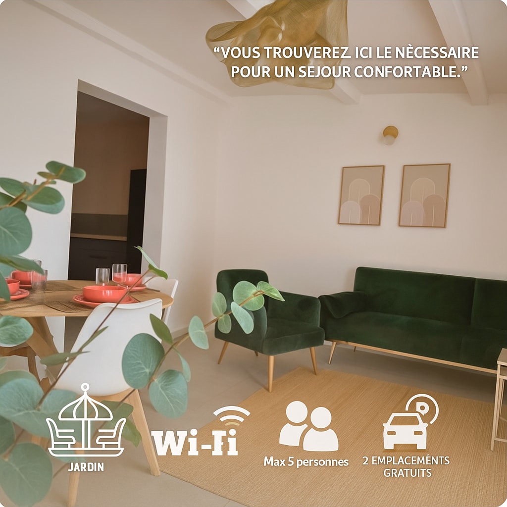 Maison de ville au calme, lumineuse,vue dégagée. Maison traversante avec jardin clos plein Sud et terrasse au Nord coin repas barbecue. La maison se compose: un salon cuisine ouverte de 35 m². La cuisine est entièrement équipé. Le salon est équipé d'un canapé convertible, TV ( Netflix, Disney+ ) et wifi . A l'étage : 2 chambres, chaque chambre dispose d'un lit double en 140 et d'un placard (drap fourni). 1 salle d 'eau avec douche spacieuse meuble vasque et toilette ( linge fourni).