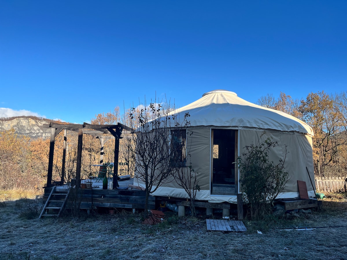 Bienvenue aux jardins d'Amagaïa, à Boulc. Un lieu de ressourcement avec piscine naturelle, 110 m2 de yourte. une roulotte + yourte d'activité (location possible avec supplément) Détendez-vous dans ce logement chaleureux, calme et élégant. Entouré d'un paysage à couper le souffle. Profitez du bain nordique 6 places (compris dans la location si vous êtes autonome supplément 50€ si on vous le prépare) une ferme auberge à 100 m où vous pourrez réserver des repas bio/local/de saison