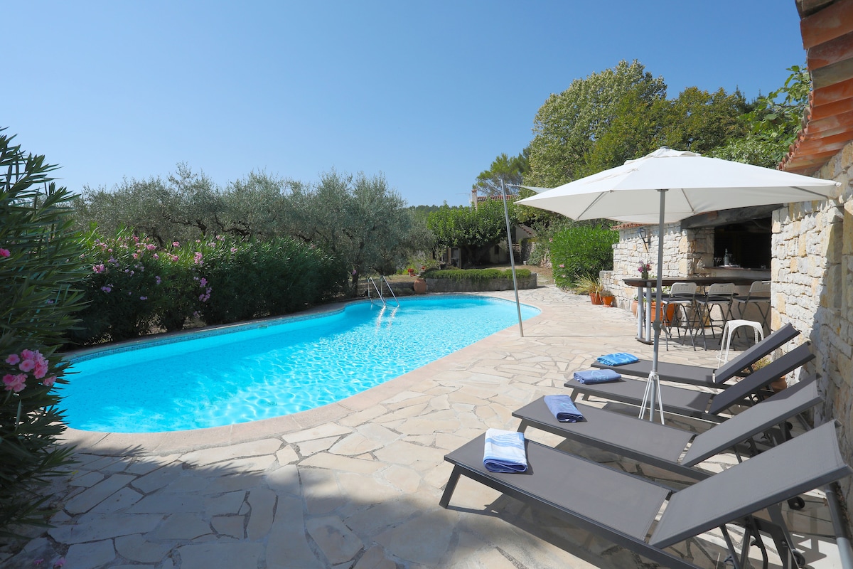 Situé à 3 kms du village et au coeur d'une magnifique oliveraie de 2 hectares, ce joli studio indépendant de 40 m2 bénéficie d'une exposition plein sud avec une vue magnifique et à 360° sur les massifs de l'Estérel et des Maures, jusqu'à la mer Méditerranée ; le dépaysement est garanti. Proche des sentiers de randonnée, du lac de St Cassien, de la rivière, à 40 mn de la mer, de CANNES, de GRASSE, à 1 H de NICE et des stations de ski. Votre petit animal de compagnie est le bienvenu si - 5 kg