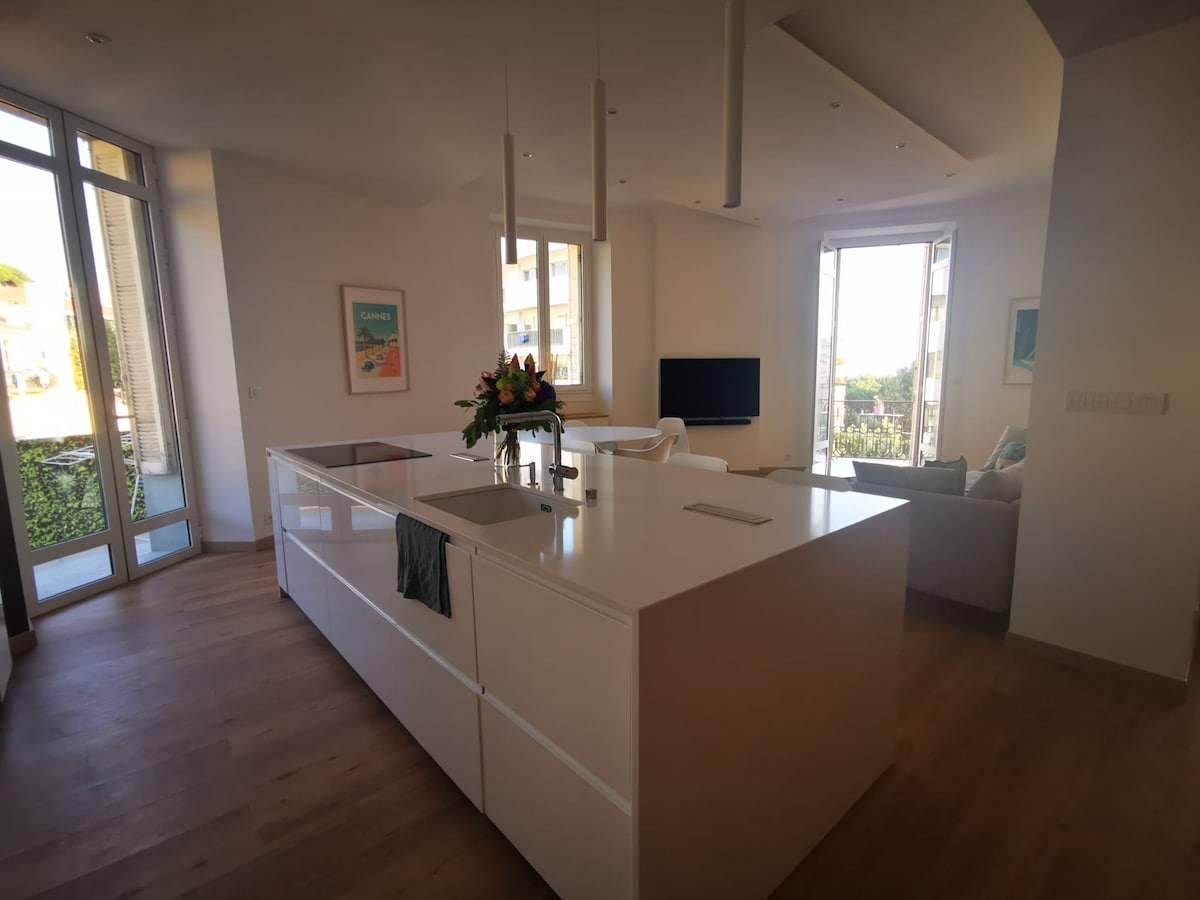 Discover this beautiful, newly renovated architect-designed apartment in the heart of Cannes. Located on the 1st floor, without elevator, this apartment includes a large living room, 2 adjoining bedrooms with independent entrance, a fully equipped kitchen, a shower room, a bathroom and a laundry room. Located at 6-minute walk from the Palais des Festivals and 7 minutes from the train station, this apartment will allow you to enjoy the joys and sunshine of Cannes while making your travel easier.