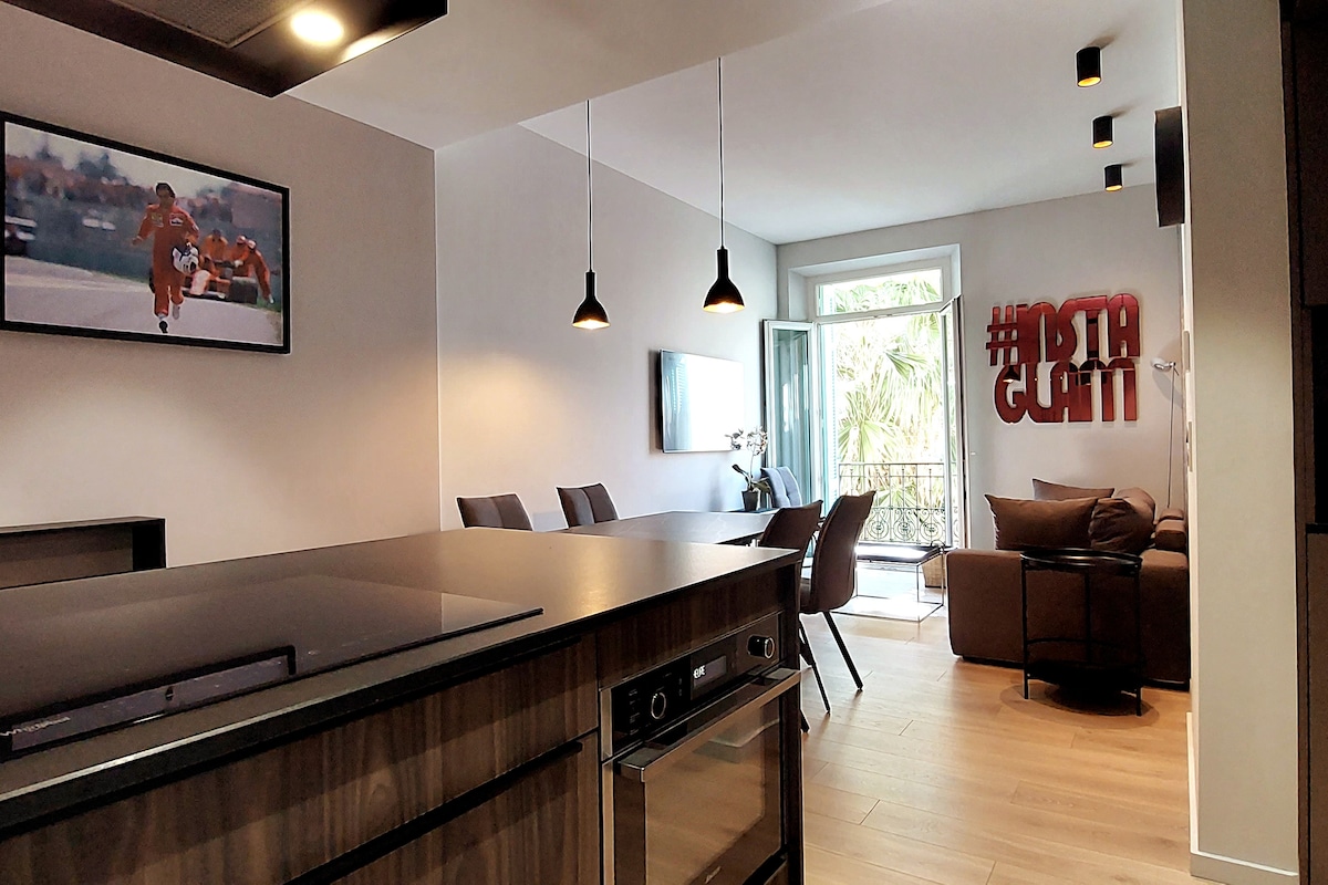 Ce logement familial, au cœur du Carré d’Or, est à 100 m de la Promenade des Anglais, avec un petit balcon offrant un aperçu de la mer. Idéal pour un ou deux couples et/ou une famille de quatre personnes. En face, un spa de 300 m² et un supermarché; restaurants variés à proximité. Il comprend deux grandes chambres avec placards, l’une avec douche, une grande salle de bain indépendante, et une cuisine semi-ouverte sur le salon, compacte mais bien équipée.