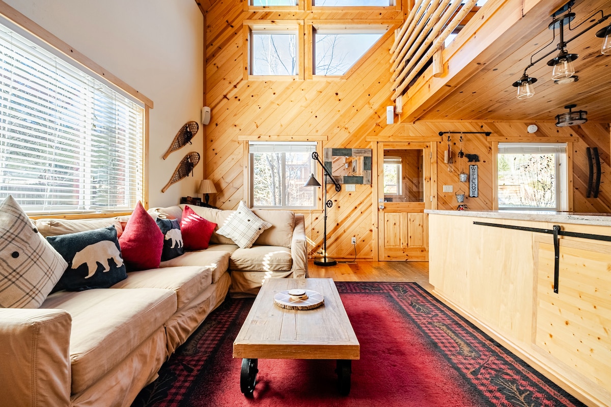 Only Bear Valley rental cabin with a lake + beachfront location. Perfect for summer/water fun. In winter, never touch your car and enjoy ski in-out access to the resort (conditions/skill level permitting). Designed by SF Bay Bridge architect Don McDonald, the Lake Chalet is ideal for relaxation and outdoor adventures for up to three families (eg 6 adults + 6 kids). Discover our 2-level cozy cabin: 3 bedrooms, large loft, two bathrooms, rustic-modern interior & amenities, decks, views!