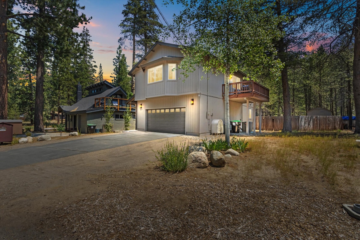 Tucked away in National Forest Land and ideally located between multiple ski resorts and the lake, our Lake Tahoe basecamp is a special place. Immersed in tall pines, woods, and the mountains, enjoy hiking, snowshoeing, and the Upper Truckee River steps from the back door. Well optimized with pool table, fireplaces, PS5, equipped kitchen, huge dining table, and comfortable furniture. With 7 beds, including 3 king and a bunk room, we can host 8 guests plus extra children 5 and younger.